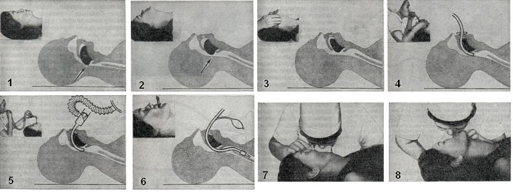 Адаптация больного к респиратору (синхронизация с собственными дыхательными движениями) достигается несколькими методами. Суггестивный метод (команда «вдох — выдох») применим у находящихся в сознании больных и эффективен при умеренной гипервентиляции. Выраженная гипервентиляция (30—40% сверх должной величины) также позволяет синхронизировать дыхательные движения больного с респиратором. Наркотические и седативные средства, подавляющие собственные дыхательные попытки, применяют при неэффективности предшествующих методов. Миорелаксанты короткого действия используют в начале искусственного дыхания; миорелаксанты длительного действия для адаптации к респиратору следует применять лишь при отсутствии эффекта от остальных методов или при необходимости подавления судорожного синдрома. Десинхронизация дыхательных движений больного и респиратора возникает чаще всего при нарушении герметичности дыхательного контура и при гиповентиляции. Экспираторные методыЭкспираторные методы применяются только в срочных ситуациях — при внезапном прекращении дыхания и невозможности применить аппаратные методы. Чтобы обеспечить проходимость верхних дыхательных путей, голову лежащего на спине пострадавшего максимально разгибают в позвоночно-затылочном сочленении, выдвигая нижнюю челюсть вперед и вверх так, чтобы подбородок занимал самое возвышенное положение (рис. 4). Обеспечение проходимости дыхательных путей облегчается введением S-образного воздуховода или интубационной трубки. Оживляющий вдувает в рот или нос пострадавшего выдыхаемый им самим воздух после предшествующего глубокого вдоха, При вдувании в рот ноздри пострадавшего должны быть зажаты пальцами или щекой оживляющего, хотя в ряде случаев эта мера является излишней, поскольку мягкое небо выполняет роль клапана и не пропускает вдуваемый воздух в полость носа. При вдувании в нос должен быть закрыт рот пострадавшего, который следует открывать при выдохе, если мягкое небо пе пропускает воздух через нос. Главный критерий эффективности экспираторных методов искусственного дыхания — расширение грудной клетки при вдувании воздуха и спадение ее при пассивном выдохе. Частота вдуваний зависит от скорости пассивного выдыхания воздуха и для взрослого человека колеблется в пределах 10—20 в 1 минуту, а объем вдуваемого воздуха каждый раз — 0,5 —1,0 л. Поскольку при давлении свыше 20 см водного столба воздух может попадать в желудок, вызывая регургитацию желудочного содержимого и другие осложнения, необходимо, чтобы давление вдоха не превышало эту величину. При хорошей проходимости дыхательных путей давление вдоха 12—15 см водного столба достаточно, чтобы вдуть в легкие пострадавшего необходимый объем воздуха. В тех случаях, когда искусственное дыхание сочетается с закрытым массажем сердца, делают одно вдувание через 4—5 сжатий грудной клетки. Если один оживляющий проводит искусственное дыхание и закрытый массаж сердца, то рекомендуется два вдувания подряд, а затем 10—12 сжатий грудной клетки. Несмотря на то, что в выдыхаемом воздухе, который вдувают пострадавшему, содержится только 15 — 17% кислорода и 2—4% углекислоты, экспираторные методы высокоэффективны в поддержании необходимого газообмена на протяжении десятков минут и даже часов. Однако эти методы не только ут