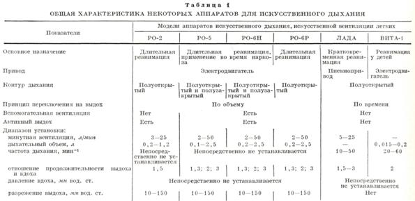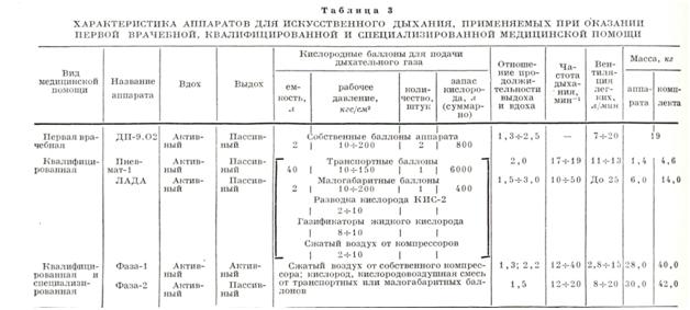 Автоматические аппараты для искусственного дыхания обеспечивают подачу кислородовоздушной смеси (35— 40%), чистого кислорода или воздуха под давлением (от компрессоров). В зависимости от приводов они подразделяются на пневматические (ДП-9.02, Пневмат-1, ЛАДА) и электрические (Фаза-1, Фаза-2). Расход газа на привод пневматических аппаратов до 4 л⁄мин. Регулировка параметров плавная (в Пневмат-1 все параметры фиксированы). Респираторы могут подключаться к аппаратам ингаляционного наркоза. Основные характеристики аппаратов искусственног дыхания приведены в табл. 3.