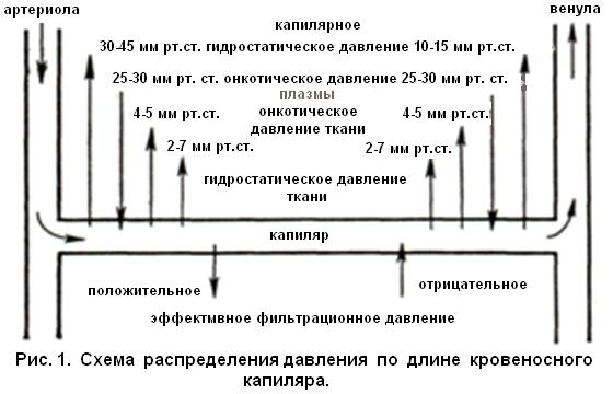 Важную роль в задержке натрия при нарушениях гемодинамики играет несоответствие скорости его фильтрации в клубочках и реабсорбции в проксимальных и дистальных отделах нефрона. Пониженная фильтрация натрия при снижении почечного кровотока часто сочетается с повышенной его реабсорбцией в проксимальных отделах нефрона, которая мало зависит от альдостерона. Сохранение в этих условиях неадекватно высокой реабсорбции объясняют снижением гидростатического и повышением онкотического давления в перитубулярных капиллярах вследствие уменьшения плазмотока в почках с возрастанием его фильтруемой фракции. Канальцевая реабсорбция усиливается также при перераспределении части почечного кровотока, а следовательно, и фильтрата из более коротких кортикальных нефронов в длинные юкстамедуллярные, где объем всасывания больше. Такое изменение кровотока в почке возникает при нарушениях системной гемодинамики, несущих угрозу ишемизации сердца и мозга. Оно реализуется через симпатоадреналовую систему, включающую компенсаторные механизмы централизации кровообращения, одним из которых является сужение почечных сосудов. Поскольку сосудам мозгового вещества почки вазоконстрикция не свойственна, кровью в этих условиях лучше снабжается не корковое, а мозговое вещество, и реабсорбция уси-ливается. Первопричиной распространенных отёков, кроме задержки натрия и первичной гиперсекреции вазопрессина, может быть снижение онкотического давления плазмы крови, ведущее к повышению фильтрационного давления в капиллярах. Однако любой массивный отёк, в том числе и гипоонкотический, не может развиться без участия механизмов избыточной задержки натрия и воды почками. Возникновение местного отёка, а также преимущественная локализация транссудата в определенных участках тела при распространенных отёках объясняются нарушением в этих тканях физико-химических процессов обмена воды через капиллярную стенку, впервые изученных Э. Старлингом. Фильтрация воды через стенку артериального конца капилляра в интерстиций обусловлена положительным в этой части капилляра фильтрационным давлением — разницей между трансмуральным гидростатическим давлением (от 30 до 50 мм ртутного столба) и трансмуральным онкотическим давлением (онкотическое давление белков плазмы около 25—30 мм ртутного столба минус онкотическое давление интерстициальной жидкости — около 4—5 мм ртутного столба), препятствующим выходу воды из капилляра, полупроницаемая мембрана которого в норме пропускает лишь весьма небольшое количество белка. По мере продвижения крови к венозному концу капилляра ее гидростатическое давление снижается до 10—15 мм ртутного столба; эффективное фильтрационное давление в венозном конце капилляра становится отрицательным, и большая часть воды фильтрата резорбируется здесь из ткани в капилляр (рис. 1).