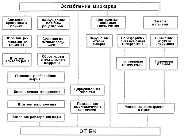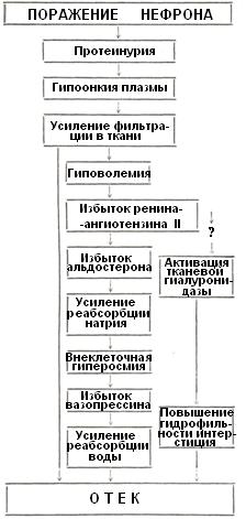 Повышение венозного давления, возникающее при сердечной недостаточности, ведет к нарастанию фильтрационного давления преимущественно в нижележащих частях тела, где наиболее рано выявляется отёк. Возрастание центрального венозного давления препятствует усилению лимфооттока, компенсирующему повышенную фильтрацию. При тяжелом застое в печени и кахексии сердечный отёк усугубляется гипоонкией. Нарастанию отёка при выраженной циркуляторной гипоксии способствует повышение проницаемости микроциркуляторного русла. Начало развитию нефротического отёка дает гипоонкия плазмы вследствие большой потери белка с мочой. Усиление при этом фильтрации воды в ткани, чему способствует повышение их гидрофильности под действием гиалуронидазы, вызывает снижение объема циркулирующей крови. Гиповолемия становится причиной гиперсекреции альдостерона и резкого ограничения экскреции натрия, что ведет к гиперосмии внеклеточной жидкости и увеличенному поступлению в кровь вазопрессина, к-рый и нарушает баланс воды (рис. 3).