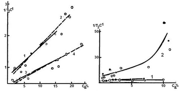 На рис. 1 видно, что существенное снижение количества клатратов происходит уже с концентрации белка 7—10%. Возможно, что соотношение числа полярных и неполярных групп на поверхности белковых молекул определяет положение и величину максимумов для трех исследованных растворов белков. При исследовании процесса продольной релаксации протонов в водных растворах ЯА с клатратами ксенона был обнаружен неэкспоненциальный характер восстановления продольной намагниченности, для которой выделены две компоненты времени спинрешеточной релаксации Т1. В диапазоне температур 275—290° К время релаксации медленной компоненты при частоте резонанса 20 МГц равнялось 300— 400 мс, а быстрой — 20—40 мс. На рис. 2 по оси х обозначена температура, по оси у — концентрация альбумина, по оси z — относительная доля воды в разных фазах, определенная методом ЯМР. Диаграмма получена по данным ЯМР следующим образом. Долю фазы 1, соответствующую воде в твердых клатратных структурах, определяли по методике работы [5]. Количественное соотношение фаз 2 и 3 вычисляли по амплитудам медленной и быстрой компонент времени продольной релаксации Т1. Для водных растворов САБ с клатратамн ксенона спад сигнала спинового эха на частоте резонанса 20 МГц разлагался на две экспоненциальные кривые, характеризующиеся медленным и быстрым временем поперечной релаксации T2. Быстрая компонента в исследованном интервале концентраций белка 0—10 % составляла 0,5—2 мс, а медленная изменялась от 10 до 100 мс в зависимости от количества клатратов и была снижена по сравнению с ее величиной в растворе без клатратов (300—900 мс). Кроме того, при образовании клатратов в растворах САБ снижалась и величина Т1 протонов водной компоненты. Когда в растворе белка образуются клатраты ксенона, количество жидкой воды уменьшается. В результате возрастает концентрация (белка относительно жидкой фазы и монотонно растет скорость продольной релаксации протонов воды в растворах САБ с клатратами ксенона (рис. 3). На рис. 3 видно, что ход зависимости роста скорости продольной релаксации 1⁄Т1 Для растворов САБ с клатратамн ксенона повторяет концентрационную зависимость 1⁄Т1 для растворов без клатратов. Такое поведение говорит о том, что на образование клатратов идет свободная вода, а подвижность оставшейся жидкой воды снижается. Об уменьшении подвижности воды при образовании клатратов свидетельствует также поведение величин энергий активации Eа движений молекул воды, определенных по линейным участкам зависимости ln Т1 для растворов ЯА с клатратами ксенона. При температурах 275—287° К в растворах ЯА величина Еа была близка к значению для чистой воды и составляла 16,8 кДж⁄моль. При образовании клатратов ксенона величина Еа возрастала в пределах 20,9—22,6 кДж⁄моль. По сравнению с поведением l/T1 (см. рис. 3) характер поведения зависимости скорости поперечной релаксации 1/Т2 протонов воды от концентрации белка в жидкой фазе образцов с клатратами отличается от аналогичной зависимости в растворах без клатратов (рис. 4). При анализе этих кривых можно заметить, что при образовании клатратов на Т2, кроме уменьшения количества свободной воды, возможно, влияет еще ряд факторов, в частности гетерогенность образцов. Поскольку наличие области клатратов с жесткой решеткой из молекул воды должны приводить к появлению магнитной неоднород