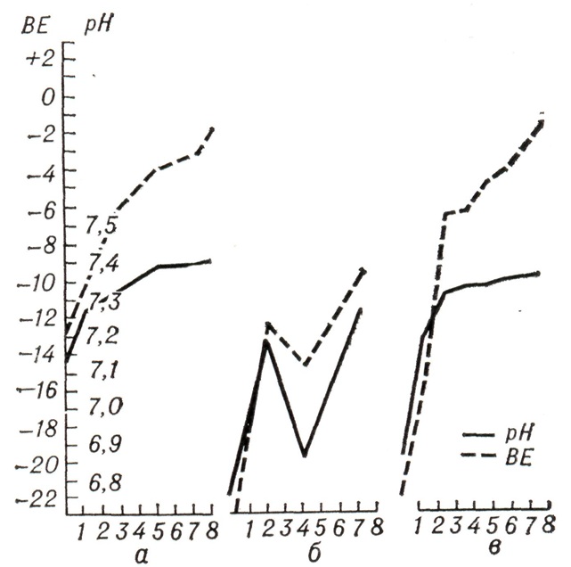 Метод Персианинова оказывает положительный эффект немедленно. Кожа ребенка становится ярко-розовой, появляется дыхание и крик. Если положительный результат получить не удалось, то следует сейчас же начинать аппаратное искусственное дыхание. Методы Легенченко и Персианинова могут использоваться также в сочетании один с другим. Методика Неговского: после освобождения дыхательных путей производят интубацию трахеи и приступают к искусственной вентиляции легких. Последнюю можно производить и с помощью маски для новорожденных с резиновым надувным обтуратором, соединяя с ней дыхательный аппарат (рисунок 8). Применяя аппаратную искусственную вентиляцию, следует правильно и бережно производить интубацию новорожденного, учитывая опасность травмирования дыхательных путей и ошибочной интубации пищевода. Искусственная вентиляция при отсутствии спонтанных дыхательных движений у ребенка проводится под давлением 35—40 сантимертов водного столба. После расправления легких и установления хороших экскурсий грудной клетки введение воздуха производится при давлении 20—25 см вод. ст. Превышение давления может привести к разрыву ткани легких. Последнее может наблюдаться и при вдувании воздуха изо рта в рот, которое производят без всякого контроля давления. Из-за опасности инфицирования новорожденного этим методом воздух нужно вдувать через 4—6 слоев стерильной марли. Целесообразно применять гелио-кислородную смесь (50% Не \ 50% 02). Метод эффективен, позволяет быстро расправить спавшиеся альвеолы легких у новорожденных, предупредить развитие первичных и вторичных ателектазов. Искусственную или вспомогательную вентиляцию гелио-кислородной смесью производят с помощью маски и портативного дыхательного аппарата. При асфиксии новорожденных (по шкале Апгар оценка 5 и 6) эффективны методы Легенченко и Персианинова. При белой асфиксии (оценка по Апгар 4 и менее) необходимо начинать с применения аппаратной искусственной вентиляции легких, одновременно вводя в вену пуповины щелочные растворы, а также применяя осторожно наружный массаж сердца. Чем тяжелее асфиксия, тем быстрее необходимо наладить аппаратную искусственную вентиляцию легких. При рождении детей в состоянии асфиксии необходимо наряду с общепринятыми мероприятиями по реанимации вводить щелочные растворы. 5% раствор бикарбоната натрия вводят медленно (в течение 30— 40 сек.) в вену пуповины в количестве 10—15—20 мл в зависимости от веса ребенка; при тяжелой асфиксии вводят на 5 мл больше. После введения щелочи в ту же вену вводят 10 мл 10% раствора глюкозы. Ощелачивающее действие бикарбоната натрия ведет к нормализации окислительных процессов в организме, устраняя патологический ацидоз (рис. 9). В известном проценте случаев у детей, родившихся в состоянии асфиксии, могут впоследствии наблюдаться различные по тяжести психоневрологические осложнения. Подобные нарушения у новорожденных не всегда связаны с длительностью срока асфиксии. Поражения нервной системы могут наблюдаться у оживленных в первые 10 минут и отсутствовать при оживлении через 30 минут. Ребенок, перенесший асфиксию даже в легкой степени, требует тщательного наблюдения и лечения под руководством педиатра. После тяжелой асфиксии могут наблюдаться повторные приступы асфиксии, связанные с нарастанием ацидоза, что я