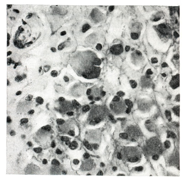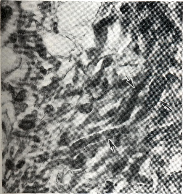 В соответствии с типом преобладающих в опухоли клеточных элементов выделяют (под близкими у разных авторов наименованиями) варианты астроцитом по следующим признакам: 1) по наличию анаплазии — недифференцированную (анапластическую, атипическую, гетеротипическую, злокачественную, малигнизированную) и дифференцированную (типическую, гомотипическую, доброкачественную); 2) по содержанию глиальных волокон — фибриллярную, протоплазматическую (плазматическую), смешанную (фибриллярно-прото-плазматическую, рис. 2); 3) по величине клеток — мелкоклеточную, крупноклеточную (к этой группе относят обычно и астроцитомы из тучных астроцитов — тучноклеточную, рис. 3); 4) по фодме клеток — из звездчатых клеток, веретеноклеточную (с ее подвариантом пилоидной — волосовидной — астроцитомы, рис. 4) и полиморфно-клеточную.