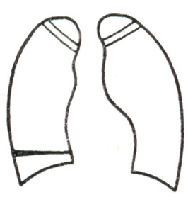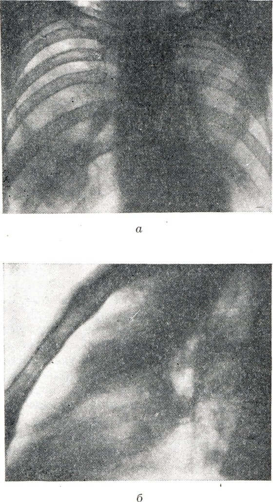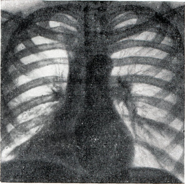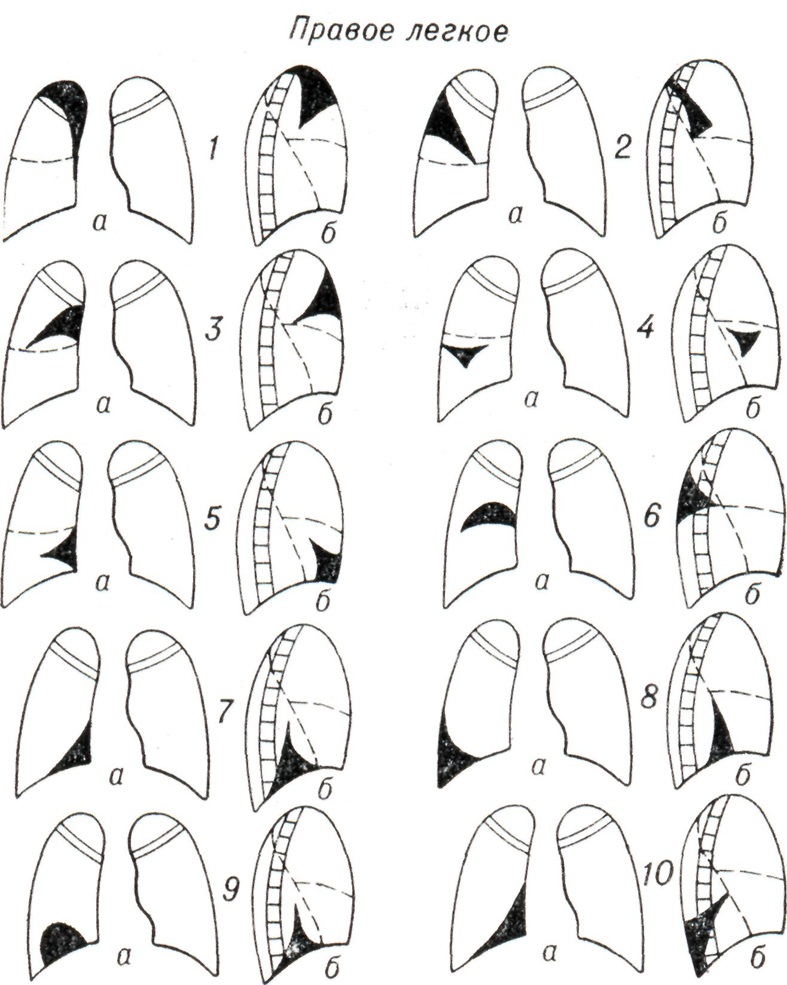 При тотальном ателектазе (рис. 3, 1 и 2) спавшееся легкое обычно уменьшено, интенсивно и равномерно затемнено. В большинстве случаев тени ребер сближены (соответственно западению грудной стенки), иногда наблюдается сколиоз грудного отдела позвоночника, выпуклостью обращенный в сторону поражения. Купол диафрагмы и тени поддиафрагмальных органов на стороне ателектаза приподняты; слева необычно высоко и медиально проецируется газовый желудочный пузырь. Срединная тень, в частности трахея, значительно перетянута в сторону ателектаза, бифуркация трахеи проецируется сбоку от тени позвоночника. Непораженное второе легкое вздуто, и его тень частично перемещена в противоположную половину грудной клетки. Такое перемещение испытывают главным образом передне-верхние позадигрудинные отделы противоположного легкого, давая в рентгенологическом отображении картину так называемой медиастинальной грыжи, то есть ограниченное дугообразной линией просветление на фоне верхне-медиальных отделов затемненного легочного поля на стороне ателектаза. Такие «грыжи» могут достигать больших размеров, в особенности при ателектазе левого легкого. Рентгенологическая картина при долевых ателектазах типична (рис. 3, 3—12). Как известно, доли легких как бы фиксированы в двух местах: у корня и из-за отрицательного внутриплеврального давления у грудной стенки. В силу эти особенностей спадение и перемещение долей легких при ателектазе происходит в случае отсутствия плевральных сращений закономерно в определенном направлении. Верхняя доля правого легкого смещается при ателектазе кверху, кнутри и кпереди в направлении передне-медиальных отделов грудной клетки. Нижняя граница тени спавшейся доли (линия малой междолевой щели) перемещается кверху, задняя (линия главной междолевой щели) — кпереди. На боковой рентгенограмме определяется треугольная тень с несколько втянутыми гладкими контурами, вершина которой примыкает к тени корня, а основание — к грудной стенке. На фоне этой тени хорошо видна линия косой междолевой щели, переместившейся кпереди. При нарастающем спадении доли последняя приближается к грудной стенке и исчезает. Спадение верхней доли может быть столь значительным, что на прямой рентгенограмме ее тень представляется узкой боковой полоской у средостения, а в боковой проекции — симулирует уплотнение легочного сегмента. Ателектаз верхней доли сопровождается расширением нижней и средней долей, наибольшему вздутию подвергаются задне-верхние отделы нижней и верхне-передние отделы средней доли. Тень корня легкого перемещается, как правило, кверху. При ателектазе правой верхней доли, как и при ателектазах других долей, наблюдаются и атипичные картины, нередко симулирующие на передней рентгенограмме картину медиастинальной «грыжи», что обусловлено главным образом плевральными сращениями, фиксирующими легкое. Рентгенологическая картина ателектаза верхней доли левого легкого отличается большим объемом, более отвесным расположением левой косой междолевой щели и не всегда четкой нижней границей тени: в части случаев она дугообразно втянута. Средняя доля при ателектазе смещается кнутри и кпереди. Верхняя граница ее перемещается книзу, нижняя, соответствующая косой междолевой щели, — кверху и несколько кпереди. На прямой рентгено