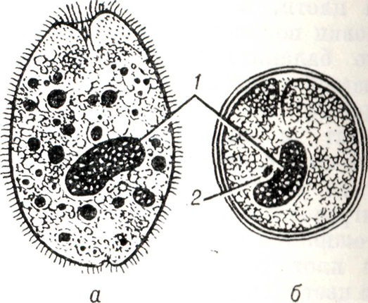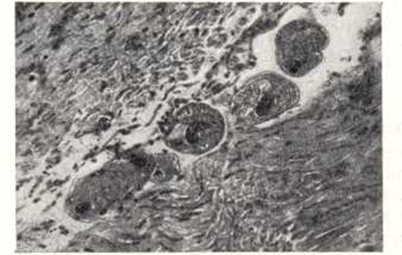 При присоединении бактериальной инфекции процесс может закончиться гангреной кишки. При надавливании на края язв и эрозий выделяется гнойное отделяемое. При Б. иногда поражается червеобразный отросток с клинической картиной острого аппендицита и нахождением балантидии в воспаленной его стенке. В начале заболевания на слизистой оболочке кишки появляются участки гиперехмии и отека, на к-рых возникают эрозии и язвы. Эпителий кишечных (либеркюновых) желез начинает усиленно пролиферировать и некротизироваться. В окружающих тканях появляется лимфоцитарный инфильтрат, к-рый, как и ткани, некротизируется, формируются эрозии, к-рые могут зажить или прогрессировать и вести к образованию язв. При проникновении инфузорий в подслизистую основу в тканях возникает воспалительный отек, кровоизлияния и инфильтрат из лимфоцитов, гистиоцитов и сегментоядерных лейкоцитов, местами формируются мелкие сливающиеся абсцессы. Язвы при Б. развиваются не одновременно: наряду с острыми язвами имеются рубцующиеся и рубцы на месте заживших язв. Паразиты обнаруживаются в краях язв, криптах желез и толще подслизистой оболочки. В мышечном слое кишечника (рис. 3) они обнаруживаются реже. Описаны также поражения тонкой кишки, миокарда, печени, почек. При обычных гистологических окрасках в пораженных тканях балантидии обнаруживаются даже спустя 24—28 час. после смерти. При дифференциальной диагностике балантидии и паразитических амеб следует помнить, что балантидии крупнее, ядро у них бобовидное, богатое хроматином, цитоплазма базофильная, содержит вакуоли. Для гистологического исследования и установления этиологического диагноза берут край язвы кишки, в тканях к-рой обнаруживают балантидии. Делают также мазки из отделяемого язв и толщи стенки кишки. Патогенез. Проникнув в организм человека через рот, балантидии локализуются в толстой кишке — преимущественно слепой кишке, реже в нижнем отделе тонкой кишки. Размножаясь в просвете кишки, они могут не вызывать отчетливо выраженных симптомов болезни, что ряд авторов расценивает как носительство. Однако при тщательном обследовании таких лиц в большинстве случаев выявляется субклиническое течение Б. При внедрении балантидии в слизистую оболочку толстой кишки образуются характерные язвы и развиваются клинические симптомы болезни. Проникновению балантидии в глубь тканей способствует фермент гиалуронидаза, к-рый они образуют в процессе своей жизнедеятельности. Экспериментально установлено, что миграционный аскаридоз также благоприятствует внедрению балантидии в глубь слизистой оболочки кишки (В. В. Богданович, 1962). Клиническая картина. Различают субклиническую, острую, хрон. рецидивирующую и непрерывно текущую формы Б.; в очагах возможно носительство В. coli. При субклиническом Б. кишечных расстройств не бывает, больные считают себя здоровыми. Однако при ректороманоскопии у них нередко обнаруживаются катарально-геморрагические и характерные язвенные поражения в дистальном отделе толстой кишки. Выявляются нарушения функций печени, явления гипо- и авитаминоза С и эозинофилия в крови. Острый Б. протекает в большинстве случаев тяжело с наличием интоксикации, лихорадки, головных болей, тошноты, рвоты. Стул жидкий, обильный, от 8—10 до 20 раз и более в сутки, испражнения нередко имеют гнилостный зап
