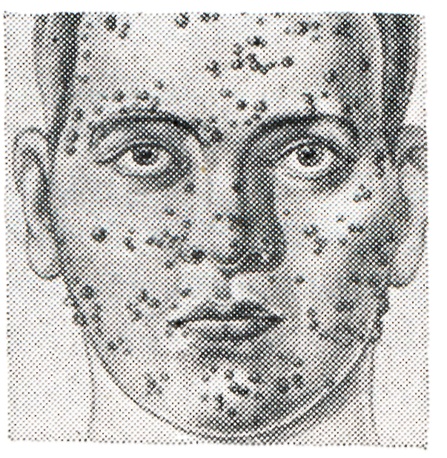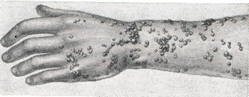 Клиническая картина. Инкубационный период 2—3 недели, реже до 3 мес. Первая стадия болезни, называвшаяся раньше лихорадкой Ороя, характеризуется острым повышением температуры до 40°, сильным недомоганием, резкой слабостью, ознобами, сопровождающимися обильным потоотделением, головной болью, болями в костях, суставах, мышцах, особенно икроножных. Лихорадка неправильного или волнообразного типа держится до 30 дней, затем идет медленное падение температуры, однако ее полная нормализация может продолжаться до 40—50 дней с момента начала острой фазы болезни. В период высокой температуры особенно часто удается выделить чистую культуру бартонелл из крови больных. До 20— 30% эритроцитов поражено возбудителем болезни (в редких случаях до 90—95%). Нарастает анемия, число эритроцитов падает до 0,5—1 млн. в 1 мм³. Возрастает непрямой билирубин. Отмечается лейкоцитоз со сдвигом влево. В периферической крови появляются эритробласты, большое количество нормобластов, полихроматофильных и базофильных эритроцитов, характерен макроцитоз. Количество ретикулоцитов увеличивается до 50% . Указанные изменения крови характеризуют нормобластический тип кроветворения. Печень увеличивается в размерах, иногда значительно, при пальпации болезненна. Спленомегалия бывает редко. Артериальное давление понижено. В случае благоприятного течения болезни возбудитель внезапно начинает исчезать из эритроцитов, гемолиз прекращается, нормализуется состав крови, температура становится нормальной, состояние больных значительно улучшается. Инфекция переходит в латентную фазу, к-рая может длиться до двух месяцев и закончиться выздоровлением или переходит во вторую стадию verruga peruana. В нек-рых случаях она может развиваться первично. На коже лица и конечностей (рис. 2 и 3), чаще вокруг суставов, появляются мелкие красные пятнышки, к-рые превращаются в узелки различных размеров, постепенно приобретающие темно-красный цвет. При этом температура может вновь повышаться, появляются боли в суставах, мышцах. Крупные узлы редки и располагаются гл. обр. в области локтевых суставов в виде сосудистых бугристых образований размером с крупный грецкий орех; они легко кровоточат, изъязвляются, при инфицировании нагнаиваются. Заживают через 3—4 мес. с образованием рубца. Часто узелки образуются и на слизистых оболочках рта, пищевода, желудка, кишечника, половых органов, в печени, селезенке, сердце, мозге и других органах. Возможны внутренние кровоизлияния в этих органах, а при изъязвлении узлов жел.-киш. тракта — кишечное кровотечение. Помимо двух этих стадий болезни, Цегарра (А. N. Zegarra, 1955) выделяет еще преэруптивную (промежуточную), при к-рой может быть нерегулярная лихорадка с ремиссиями и состояние «здорового» носительства. Кроме острой формы болезни, встречаются затяжные, хронические, стертые и смешанные.