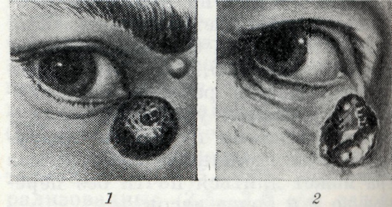Клиническая картина. Клинические проявления базалиомы многообразны. Первоначально она представлена узелком размером с чечевичное зерно, выступающим над поверхностью кожи (рис., 1), плотной консистенции, розоватого, розово-желтоватого или матово-белого циста, напоминающим жемчужину. Подобных узелков может быть несколько, они сливаются, образуя бляшку дольчатого вида. На ее поверхности могут быть телеангиэктазии. Отдельные узелки в центре бляшки могут спонтанно исчезать или изъязвляться, а по периферии образуется валик, состоящий из патово-беловатых узелков. В дальнейшем в одних случаях наступает (после довольно длительного периода) изъязвление, при этом в центре образуется эрозия с неровнымдном или язва с кратерообразными краями (рис., 2). Постепенно язва распространяется по площади и в глубину, разрушая подлежащие ткани (хрящ, кость). В других случаях происходит образование неизъязвленыой опухоли, покрытой истонченной блестящей кожей с телеангивктазиями. Иногда образуется опухоль в виде выступающего над поверхностью кожи образования дольчатого строения (имеет вид цветной капусты) на широком или узком основании. Наблюдается и плоская рубцующаяся форма Б., при к-рой первоначально образовавшаяся в центре узелка эрозия самопроизвольно рубцуется, а по периферии продолжается рост узелков и образование новых эрозированных участков. При пигментированной Б. узелки имеют более темную окраску (синевато-коричневую, коричневато-черную). Течение Б. длительное, торпидное, особенно при поверхностной форме. При изъязвлении Б. течение осложняется присоединением инфекции с появлением признаков воспаления в окружности опухоли. Деструирующий рост первичной и рецидивирующей опухоли проявляется разрушением подлежащих хрящей, кости, прорастанием в близлежащие полости (переход с кожи крыла носа в полость носа, разрушение хрящей ушной раковины и др.).