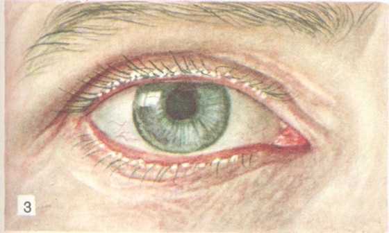 Клиническая картина. При легкой форме чешуйчатого, или простого, Б. имеются лишь незначительная припухлость и покраснение краев век, усиливающиеся при раздражении и напряжении глаз. Кроме того, можно обнаружить немногочисленные мелкие чешуйки — частицы эпидермиса или желтоватые тонкие жирные корочки — засохшее отделяемое сальных желез. Эти чешуйки плотно прикреплены к коже у основания ресниц и отчасти к самим ресницам (цветн. рис. 3).