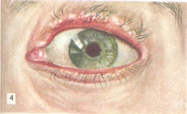 Гиперемированные и припухшие края век покрываются желтоватыми или буроватыми корочками, плотно прикрепленными к коже у основания ресниц и часто склеивающими ресницы в пучки. Местами видны не покрытые корочками маленькие гнойнички вокруг основания ресниц. По снятии корочек под ними обнаруживаются покрытые гноем и кровоточащие язвочки, к-рые нередко сливаются между собой, образуя удлиненную по краю века язвенную поверхность. При попытке удаления корочек часто вместе с ними удаляются и ресницы.