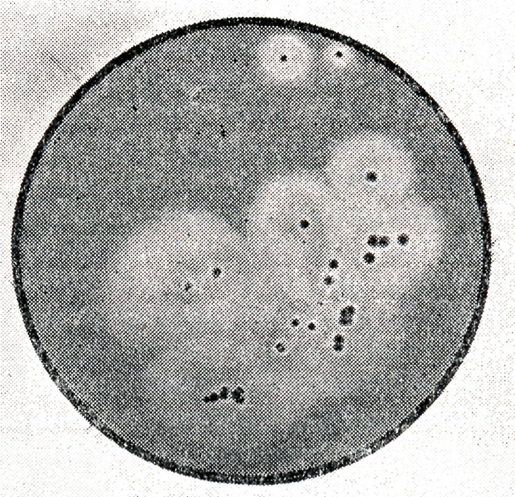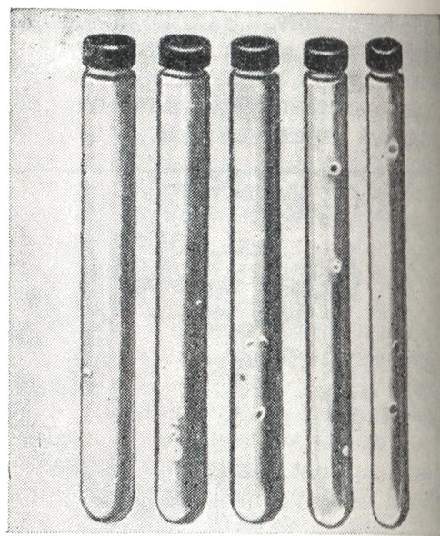 При наличии в пробе ботулинического токсина погибают две мыши, к-рым вводился фильтрат без сывороток, остальные две остаются живы. Обычно картина болезни и гибели мышей очень характерна: появляется учащённое дыхание, состояние полного расслабления мышц, западение мышц брюшной стенки («осиная талия» — рис. 10), параличи и судороги перед смертью. В случае гибели всех 4 мышей следует повторить реакцию нейтрализации с экстрактами, разведёнными в 5, 10, 20, 100 раз. При разведении экстрактов посторонняя микрофлора теряет способность убивать мышей, а ботулинический токсин, обладая обычно большей биологической активностью, будет вызывать гибель мышей при разведении фильтратов. В случае обнаружения в реакции с поливалентной сывороткой ботулинического токсина сразу же ставится развёрнутая реакция нейтрализации для определения типа токсина с типоспецифическими диагностическими сыворотками. Особое внимание нужно обратить на постановку реакции нейтрализации с сывороткой крови больного, т. к. её обычно бывает мало. Следует тщательно отделить сыворотку от сгустка крови и сразу поставить развёрнутую реакцию нейтрализации с моновалентными ботулиническими сыворотками типов А, В, Е (остальные типы Б. встречаются очень редко). При получении положительной реакции нейтрализации с диагностическими ботулиническими сыворотками даётся заключение о наличии в исследуемом материале ботулинического токсина и указывается его тип. Нередко постановку реакции нейтрализации как с поливалентной, так и с моновалентными сыворотками приходится повторять из-за неспецифической токсичности посторонней микрофлоры, к-рая обычно имеется в рвотных массах, кале, поэтому в лучшем случае ответ о наличии токсина в пробе может быть дан на 2—3-й день, а о его типовой принадлежности — на 3—5-й день от начала исследования. В случае невозможности обнаружения токсина в исследуемых материалах проводятся исследования по обнаружению возбудителя Б. С этой целью производится посев 3—5 мл подготовленного материала на жидкие питательные среды. Для первичных посевов лучше использовать казеиново-грибную или казеиново-кислотную среду, бульон Хоттингера или среду типа Тароцци. Необходимо, чтобы рН был в пределах 7,2—7,4. Обязательным является также наличие в мясных средах мясного или печеночного фарша, а в казеиновых — отварною пшена и ваты. Пробирка или флакон должны быть заполнены питательной средой не менее чем наполовину. Перед посевом в среды добавляют 0,5% глюкозы. Посевы должны производиться в среды в больших пробирках или во флаконах ёмкостью по 100 - 200 мл. Сверху среда заливается слоем вазелинового масла толщиной в 0,5 см. Следует особенно помнить о том, что лучше засевать исходный посевной материал в большой объем среды (70—150 мл), чтобы культуральной жидкости первичного посева хватило на все исследования, Последующие пересевы исследуемых проб из первичного посева в теже жидкие питательные среды могут не дать токсинообразования в среде, Посев следует производить в четыре флакона, два из к-рых прогревают при t° 80° 20 мин. Два других флакона после посева не прогревают. Все флаконы помещают в термостат при t° 28 и 35° (в каждый термостат один прогретый, один непрогретый). Если в исследуемом материале возбудители Б. находятся преимущественно в вегетативной форме, то рост в пос