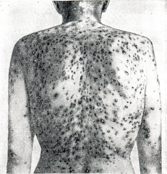 Наиболее частой и типичной формой Б. является угревидно-пустулезная (син.: acne bromica, бромные угри, рис. 1). Проявляется в виде фолликулярных пустул красновато-синюшного цвета с наклонностью к группировке, слиянию и нагноению, в результате чего возникают обширные гирляндоподобные очаги, покрытые гнойными корками. В дальнейшем они превращаются в язвенные эктимо- и рупиоподобные очаги, подживающие в центре и растущие по периферии.
