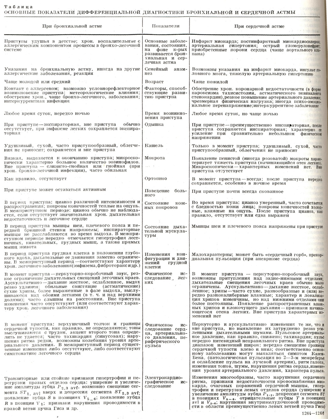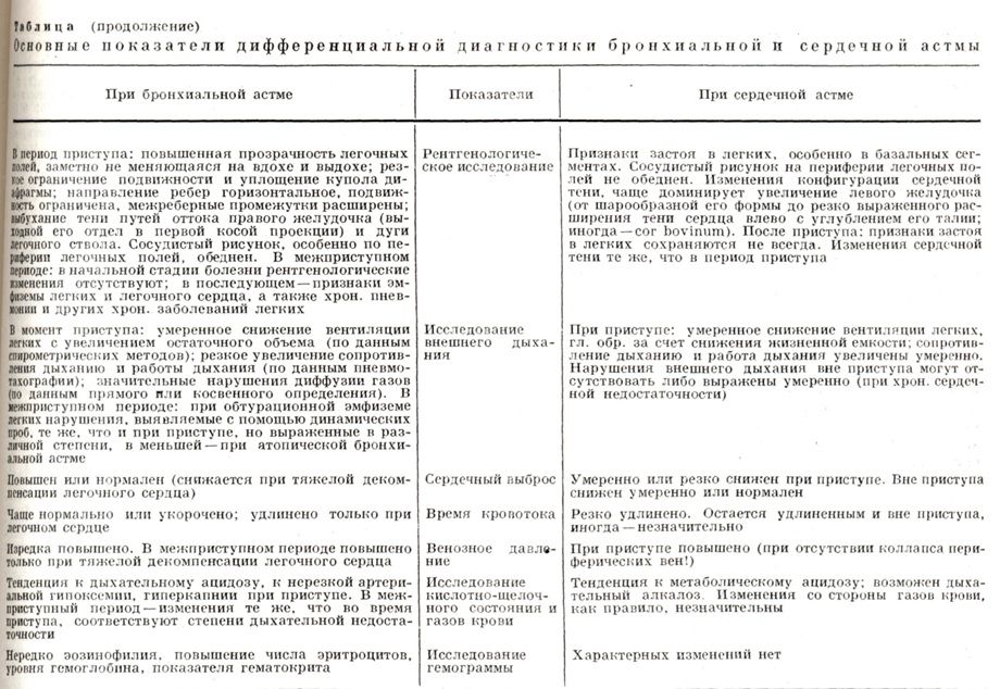 При перкуссии отмечается высокий коробочный звук с нек-рым укорочением в паравертебральных отделах; аускультативно дыхание ослабленное, сухие свистящие хрипы на выдохе; у детей раннего возраста нередко прослушиваются и влажные средне- и мелкопузырчатые хрипы в фазе вдоха. Пульс частый, на высоте приступа удушья во время вдоха наполнение пульса уменьшается, что может производить впечатление аритмии. Артериальное давление определяется в пределах верхней границы нормы; сердце расположено срединно, границы его определяются с трудом из-за эмфиземы лёгких; тоны сердца резко приглушены. Печень выступает из подреберья на 2 — 4 см. На ЭКГ определяется тахикардия, отклонение электрической оси сердца вправо, высокий зубец Р во II — III отведениях, сниженные зубцы Т, признаки повышения давления в системе лёгочной артерии и нарушения восстановительных процессов миокарда. Тяжёлое состояние, обусловленное приступом удушья, под влиянием лечения постепенно улучшается: дыхание становится более свободным, мокрота отделяется легче. В после приступном периоде в течение нескольких дней или недель происходит обратное развитие изменений в органах дыхания и кровообращения, возникших вследствие приступа. Нередко на фоне органических изменений в лёгких (хрон. пневмония) у детей наблюдается развитие астматического состояния. Из осложнений приступа Б. а. следует отметить ателектазы лёгких, пневмонию, значительно реже интерстициальную и подкожную эмфизему, спонтанный пневмоторакс. При длительном и тяжёлом течении Б. а. в сочетании с хрон. бронхо-лёгочным процессом возможно развитие хрон. лёгочного сердца. Смертельный исход может наступить от асфиксии во время приступа удушья, реже — вследствие анафилактического шока, гипофункции надпочечников. Диагноз ставится на основании анамнеза, клинико-лабораторных и рентгенологических данных, а также результатов кожных аллергических проб. Б. а. у детей необходимо дифференцировать с бронхиолитом, пневмонией, протекающей с астмоидным синдромом, врожденными энзимопатиями (муковисцидоз, дефицит α1-антитрипсина и др.), инородными телами, аномалиями развития и опухолями дыхательных путей; затруднённое дыхание у детей может также возникать ввиду сдавления трахеи и бронхов увеличенными лимф, узлами и вилочковой железой. ПрогнозСвоевременно начатое комплексное, систематически проводимое этапное лечение (стационар— санаторий — поликлиника — лесная школа) у большинства детей приводит к улучшению состояния и прекращению приступов удушья. У нек-рых больных, однако, улучшения состояния не наблюдается. ЛечениеДля купирования приступа Б. а. у детей применяют те же средства, что и у взрослых (в соответствующих дозах). Особое внимание следует обратить на лёгкие приступы и приступы средней тяжести, чтобы не допустить их перехода в тяжёлые, угрожающие жизни. Для этого при появлении первых симптомов приступа применяют бронхолитические средства в форме порошков, таблеток, суппозиториев или ингаляций; рекомендуется поставить банки, сделать ножную и ручную горячую ванну, закапать в нос 3% раствор эфедрина гидрохлорида. Необходимо успокоить ребёнка, отвлечь его внимание игрушками, книгами, обеспечить хороший доступ свежего воздуха. В более тяжёлых случаях переходят на подкожные инъекции растворов адреналина (0,