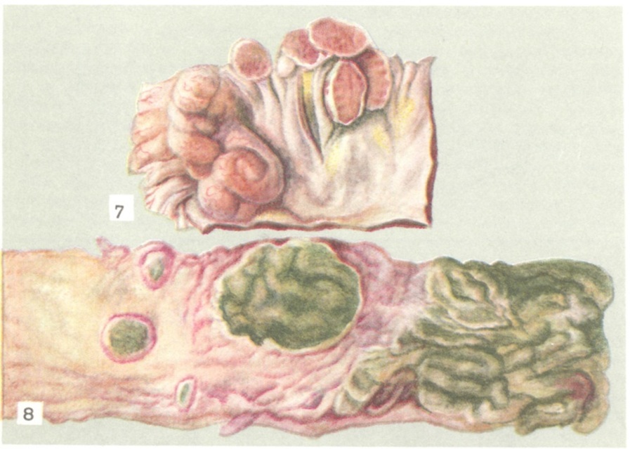 Чаще перфорация брюшнотифозных язв возникает в терминальном отделе тонкой кишки на расстоянии 10—40 сантиметров от илео-цекального клапана, реже в толстой кишке (слепая, сигмовидная). Крайне редко встречаются перфорации брюшнотифозных язв желчного пузыря, хотя поражения желчных путей при Брюшной тиф составляют около 2,5%. Прободения при Брюшной тиф чаще встречаются у мужчин старшего возраста при среднетяжёлых или тяжёлых формах болезни. Отмечена прямая зависимость между глубиной поражения групповых лимф, фолликулов и частотой кишечных осложнений. Как правило, отмечаются однократные перфорации, но описаны прободения по 3, 5 и более раз у одного и того же больного за время болезни. Перфорация влечёт за собой развитие разлитого перитонита (смотри). В части случаев перфорационное отверстие в стенке кишки может быть прикрыто сальником, и тогда у больного устанавливают явления ограниченного (местного) перитонита. Развитие перитонита возможно и в случаях глубокой пенетрации брюшнотифозной язвы. Некроз брыжеечных лимф, узлов, нагноившийся инфаркт селезёнки, тифозный сальпингит также могут служить причиной брюшнотифозного перитонита. Перфорация стенки желчного пузыря сопровождается развитием желчного перитонита; при этом и в желчи, и в гнойном выпоте находят брюшнотифозные палочки. Симптомов, патогномоничных для прободений брюшнотифозных язв, не существует. Клиника таких осложнений складывается из симптомов Брюшной тиф и перитонита. Такие симптомы, как «кинжальные» боли в животе, резкое изменение общего состояния больного, заострение черт лица, частый пульс малого наполнения, встречаются редко, в основном при стёртых, так наз. амбулаторных формах Брюшной тиф. Симптомы перитонита маскируются тяжёлым общим состоянием больного, обусловленным угнетением центральной нервной системы. Учитывая тяжесть состояния, бред, спутанное сознание, жалобы таких больных надо воспринимать весьма критически. Отсутствие печёночной тупости при перкуссии или наличие свободного газа в брюшной полости, определяемое рентгенологически, признаки свободной жидкости в брюшной полости, напряжение мышц передней брюшной стенки служат достаточным основанием для диагноза перфорации брюшнотифозной язвы. Прободение брюшнотифозной язвы в случаях лёгкой формы Брюшной тиф диагностируется легче, чем при тяжёлой форме. В условиях спорадического распространения Брюшной тиф перфорации часто своевременно не распознаются, а у некоторых больных до появления таких осложнений и ревизии брюшной полости не диагностируют Брюшной тиф. Момент перфорации у ряда больных сопровождается острыми болями в животе, симптомами коллапса. Черты лица заостряются, на лбу появляются капельки пота, пульс становится частым, его напряжение и наполнение ослабевают, артериальное давление падает. Температура тела больного снижается, может стать нормальной или субнормальной. Иногда наблюдаются позывы на рвоту. Язык за 2—3 часа, прошедших с момента развития этой катастрофы, становится сухим, имевшаяся до этого лейкопения сменяется нормо- или лейкоцитозом. Перистальтика кишок ослабляется, исчезает печёночная тупость. Симптомы раздражения брюшины могут развиваться постепенно: напряжение мышц передней брюшной стенки, положительный симптом Щеткина — Блюмберга нередко выявля