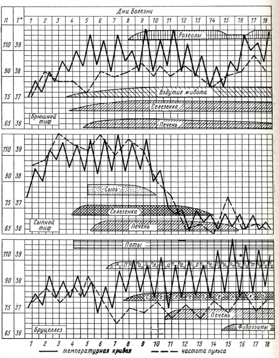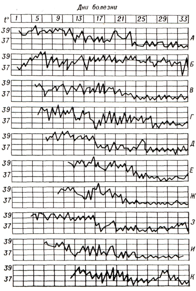 Гемограмма после 4—5-го дня от начала болезни становится характерной: количество лейкоцитов в 1 микролитров крови снижается до 4500— 2500, в лейкоцитарной формуле отмечается нейтропения со сдвигом лейкоцитарного ряда влево, анэозинофилия, относительный лимфоцитоз; РОЭ ускорена. После 6—8-го дня от начала болезни клиническая картина приобретает полную очерченность; в последующие дни лихорадочного периода болезни степень интоксикации организма, нарушения со стороны отдельных органов и систем, описанные выше, продолжают нарастать. На этом фоне могут возникнуть обострения Брюшной тиф. В случаях благоприятного течения болезни после продолжительного срока повышенной температуры при естественном течении Брюшной тиф температурная кривая приобретает амфиболический характер (с колебаниями в 2—2,5° между утренней и вечерней температурой), интоксикация ослабевает, становятся менее выраженными многие важные симптомы болезни: начинается период выздоровления. К особенностям течения неосложненного Брюшной тиф (циклическая форма средней тяжести) следует отнести те случаи болезни, которые сопровождаются развитием рецидивов и бактерионосительства. В пожилом и старческом возрасте болезнь протекает при отсутствии ряда симптомов, свойственных заболеваниям у молодых: температурная кривая носит неопределённый характер, розеолезная сыпь часто отсутствует, гепатолиенальный синдром выражен незначительно, вместо лейкопении может наблюдаться нормальное или слегка повышенное количество лейкоцитов в 1 микролитров. Эти особенности клинического течения болезни значительно затрудняют диагностику; при развитии осложнений у пожилых больных Брюшной тиф (особенно в случаях перфорации язвы в стенке тонкой кишки с развитием перитонита) также возникают большие диагностические затруднения. Из вариантов клинического течения Брюшной тиф следует прежде всего назвать абортивную форму, при которой вслед за коротким достаточно выраженным периодом развития клинических симптомов возникает резкий перелом и больной начинает поправляться. При атипично протекающих лёгких и легчайших формах болезни (старое название «амбулаторный брюшной тиф») интоксикация выражена слабо, самочувствие и физ. силы сохраняются в такой мере, что заболевший может продолжать работать, ходит, посещает поликлинику и тому подобное. У таких больных интоксикация организма выражена незначительно, температура бывает не выше 38°, лихорадочный период короткий, увеличение печени и селезёнки отсутствует или выражено слабо, сыпь на коже появляется редко. Тяжёлые формы Брюшной тиф — гиперпиректическая и геморрагическая — встречаются не чаще чем в 0,5% случаев. Последняя из названных форм характеризуется развитием множественных геморрагических элементов (петехий, экхимозов) на коже и слизистых оболочках в сочетании с обычными розеолезными элементами; у таких больных могут быть носовые, кишечные, маточные кровотечения, макрогематурия. В отдельных, редко встречающихся случаях наблюдается так наз. колитиф, который характеризуется высокой лихорадочной реакцией, спонтанными болями в правой подвздошной области и локальными болями при пальпации живота соответственно положению слепой кишки, метеоризмом, жидким или полужидким стулом с примесью слизи. При заболеваниях Брюшной ти