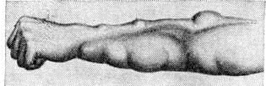 Узловая форма характеризуется образованием в подкожной жировой клетчатке множественных жировых узлов, размер которых варьирует от 0,5 до 10 сантиметров. От обычных липом эти образования отличаются, помимо многочисленности, несколько большей плотностью, довольно чёткой отграниченностью от окружающей клетчатки и болезненностью при пальпации. Степень болезненности может быть различной — от незначительной до весьма выраженной. Локализация узлов различна, обычно несимметрична; никогда не поражаются кисти рук и стопы. Особенно часто узлы располагаются на предплечьях (рисунок 1), плечах, бёдрах, туловище, очень редко на лице. При длительном существовании они становятся более плотными вследствие развития соединительной ткани и могут спаиваться с кожей и подлежащими тканями.