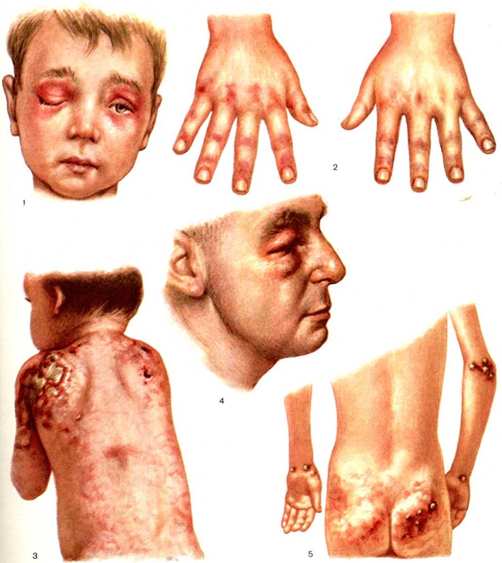 Диффузная слабость скелетных мышц с болями и отёком ограничивает двигательные возможности ребёнка и нередко приводит почти к полной обездвиженности. У детей значительно чаще, чем у взрослых, развиваются сухожильно-мышечные контрактуры (рисунок 3) и кальциноз. В то время как у взрослых развитие кальциноза мышц означает окончание активной фазы заболевания, у детей распространённый кальциноз может наблюдаться в сочетании с активным Дерматомиозит. Иногда кальцинаты частично выступают над поверхностью кожи (цветной рисунок 5). Поражение дыхательных и глоточных мышц проявляется дисфагией (смотри полный свод знаний), дизартрией (смотри полный свод знаний), снижением экскурсии грудной клетки. Прогрессирующее поражение дыхательных мышц может привести к остановке дыхания. У половины больных отмечается артралгия. Могут наблюдаться артриты, иногда с последующей деформацией суставов. Поражение лёгких при Дерматомиозит выражается чаще всего сосудисто-интерстициальной пневмонией, характеризующейся прогрессированием процесса, формированием лёгочного фиброза, появлением признаков лёгочного сердца и бронхопневмонией. Возможно наслоение вторичной инфекции, туберкулёза лёгких. Плеврит может быть как сухим, так и экссудативным, чаще без значительного выпота, с развитием адгезивных процессов. Поражение сердца чаще проявляется диффузным или очаговым миокардитом (смотри полный свод знаний), миокардиодистрофией и реже эндомиокардитом, миоперикардитом или панкардитом (смотри полный свод знаний). Иногда наблюдаются птоз (цветной рисунок 1), экзофтальм. В активной фазе заболевания в той или иной степени поражаются сосуды глазного дна. Явления гастроэнтероколита (смотри полный свод знаний) отмечаются у половины больных детей, иногда с кровотечениями, язвенными процессами вплоть до перфорации. Абдоминальный синдром (смотри полный свод знаний Псевдоабдоминальный синдром) обычно сопровождает тяжёлую клинической картину и является следствием распространённого васкулита и дистрофических изменений (лечение кортикостероидами усиливает трофические нарушения). Генерализованное поражение мышц нередко симулирует неврологический симптоматику, в то же время истинное поражение центральной и периферической нервной системы встречается с большим постоянством. В большинстве случаев Дерматомиозит сопровождается в той или иной степени выраженной гепатоспленомегалией (смотри полный свод знаний Гепато-лиенальный синдром), лимфаденопатией. Наблюдаются ускоренная РОЭ, белковые, ферментативные и иммунологический сдвиги, небольшая протеинурия с умеренными изменениями осадка мочи. Степень выраженности этих изменений совпадает с активностью процесса. ЛечениеПри выраженной активности Дерматомиозит назначают преднизолон, 1—3 миллиграмм на 1 килограмм веса ребёнка в сутки. Когда динамика поражения дыхательных и глоточных мышц бывает торпидной, необходимо применение «ударных» доз (4—6 миллиграмм на килограмм веса в сутки). При стабилизации процесса (обычно через 4—8 недель) дозу постепенно снижают (индивидуально) до поддерживающей (от 20 до 5 миллиграмм в сутки). Поддерживающую терапию больные получают длительно, иногда годами, находясь под амбулаторным наблюдением. Целесообразно применение антихолинэстеразных средств, салицилатов, пироз