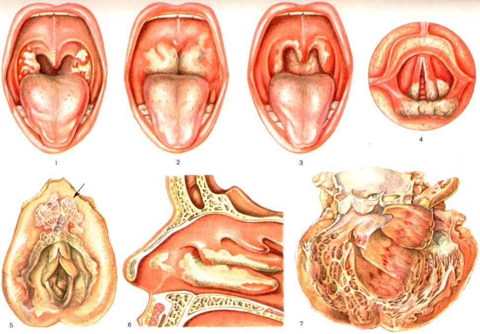 Дифтерия зева — наиболее частая форма; она наблюдается в 85—90% и более всех случаев Дифтерия. Различают три основные формы: локализованную, распространённую и токсическую. Локализованная форма характеризуется образованием на миндалинах типичных налётов в виде белых и серовато-белых наложений с гладкой поверхностью, чётко очерченными краями; они плотно сидят на подлежащей ткани и не снимаются тампоном, за пределы миндалин не переходят (цветной рисунок 1). Слизистая оболочка зева умеренно гиперемирована. Боль при глотании умеренная или слабо выраженная. Иногда налёты имеют вид небольших бляшек, располагающихся преимущественно в лакунах миндалин (островчатая форма). Регионарные (верхнешейные) лимфатический, узлы умеренно увеличены и болезненны при ощупывании. Интоксикация выражена относительно слабо, она проявляется лишь умеренным повышением температуры, некоторым расстройством самочувствия, плохим аппетитом, слабостью, умеренной тахикардией. Распространённая форма проявляется налётами, распространяющимися за пределы миндалин — на слизистую оболочку нёбных дужек, язычка, а иногда всей нёбной занавески (цветной рисунок 2). Умеренная боль при глотании. Реакция со стороны регионарных лимфатический, узлов примерно такая же, как и при локализованной форме; их припухлость и болезненность могут быть более выраженными. Более выражены и явления общей интоксикации: температура повышается до 38—39°, общая разбитость, слабость, анорексия, головные боли, расстройство сна, иногда вначале наблюдается рвота. Токсическая форма (токсическая Дифтерия) в большинстве случаев начинается бурно: температура поднимается до 39° и выше, появляются головные боли, выраженная слабость, расстройство сна, анорексия, иногда рвота и боль в животе. Изредка отмечаются явления возбуждения или выраженная вялость, адинамия. Иногда при наличии тяжёлого процесса в зеве общие клин, проявления интоксикации выражены умеренно, самочувствие нарушается относительно мало. Умеренная боль при глотании. В зеве — распространённые налёты. На 2—3-й день болезни поражение зева принимает весьма характерный вид: слизистая оболочка мягкого неба, глотки отёчна, но гиперемирована относительно слабо; миндалины резко увеличены и нередко почти соприкасаются друг с другом; их поверхность выстлана толстыми бугристыми налётами белого и грязно-белого цвета, распространяющимися на мягкое и твёрдое небо (цветной рисунок 3). Язык обложен, губы сухие, потрескавшиеся. Из зева ощущается специфический неприятный сладковато-гнилостный запах. Иногда процесс распространяется на носовую часть глотки и полость носа; появляются обильные серозные, серозно-кровянистые выделения из носа. Кожа около носовых отверстий и на верхней губе экскориируется. Одновременно с развитием процесса в зеве или несколько позже в области верхне-шейных лимфатический, узлов появляется болезненный инфильтрат плотноватой консистенции с расплывчатыми контурами. Над поражёнными лимфатический, узлами и в их окружении на большем или меньшем протяжении мягкие ткани (подкожная клетчатка) отёчны (рисунок 4). Кожные покровы над отёчными тканями сохраняют нормальную окраску. Надавливание в области отёка безболезненно и не оставляет ямок; при толчкообразном ударе пальцем ткани сотрясаются наподобие желе или сту