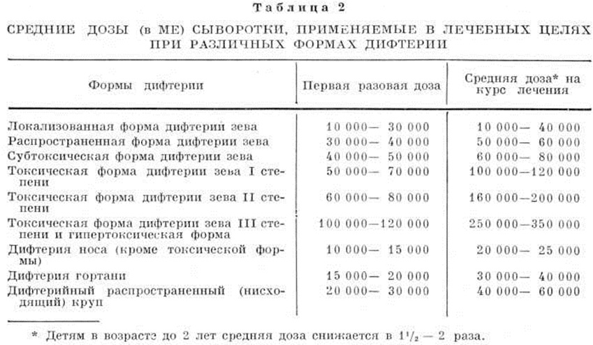 ЛечениеПри тяжёлой форме и наличии осложнений большое значение имеют правильно организованный режим и внимательный уход, осуществляемые в больничных условиях. В начальной стадии болезни, при тяжёлой форме, обязательно постельный и охранительный режим. При лёгких формах Дифтерия (локализованной форме Дифтерия зева, Дифтерия носа и так далее) после исчезновения острых явлений дети могут вставать для принятия пищи, коллективных занятий и неутомительных игр. При токсической Дифтерия даже при отсутствии осложнений больной содержится в больнице с соблюдением постельного режима в течение следующих минимальных сроков: при субтоксической и токсической Дифтерия зева I степени — до 21 — 28-го дня, при токсической Дифтерия II степени — до 40-го дня и при токсической Дифтерия III степени — до 50-го дня болезни. Строгое длительное постельное содержание предписывается также при наличии миокардита и полиневрита. В первые дни при острых изменениях в зеве назначается легкоусвояемая жидкая и полужидкая пища. Особое место занимает серотерапия (смотри полный свод знаний), целью которой является ликвидация специфической интоксикации. Дифтерийная антитоксическая сыворотка в ранние сроки болезни — высокоэффективное средство. При лёгких формах (при Дифтерия носа, локализованной Дифтерия зева, изолированном крупе в начальной стадии) можно ограничиться однократным введением сыворотки и лишь при отсутствии явного эффекта на следующий день повторить инъекцию в той же или половинной дозе. При распространённой форме, крупе во второй и третьей стадиях и особенно при субтоксической и токсической формах необходимо многократное введение сыворотки до значительного уменьшения явлений местного процесса (налётов); сыворотка вводится в дозах, сниженных против начальной вдвое, втрое. Первое введение проводится дробно по модифицированному способу Безредки (смотри полный свод знаний Безредки методы): вначале вводят подкожно 0,1 миллилитров, через 30 минут — 0,2 миллилитров и спустя ещё 1 — 1½ часа всю остальную дозу сыворотки. Доза сыворотки устанавливается исходя из тяжести болезни (клинической, формы) и сроков, истекших с момента заболевания (смотри таблица 2). Некоторые авторы [Г. Рамон (G. Ramon), 1933; М. П. Мухамедов, 1942; Н. П. Кудрявцева; М. С. Залужная, 1963] с целью стимуляции активной продукции антитоксина рекомендуют одновременно с сывороткой вводить больным дифтерийный анатоксин (в дозе 0,5—1 миллилитров в остром периоде болезни первые две инъекции с интервалом в 5—6 дней, третью — через месяц). У ранее привитых детей такое лечение оказывает быстрое действие, стимулируя продукцию антитоксина по механизму ревакцинации (смотри полный свод знаний). При токсических формах Дифтерия дополнительно рекомендуется переливание одногруппной крови (40—150 миллилитров) или нативной плазмы (60—150 миллилитров) и её заменителей. Применяют внутривенные вливания гипертонического (25%) раствора глюкозы. Курс лечения 7—12 дней. Необходимо назначение витаминов. Аскорбиновая к-та назначается при выраженной интоксикации по 300—600—1000 миллиграмм в сутки за 2—3 приёма в течение 7—10 дней; в дальнейшем суточная доза снижается вдвое-втрое. В остром периоде аскорбиновую кислоту можно вводить парентерально (внутривенно, внутримышечно) в 5—10% растворе по 2—3 миллилитров. Никотиновая кислота 