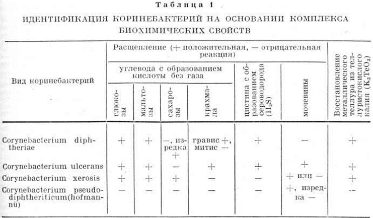 Серологические исследования основаны на обнаружении антибактериальных антител, так как показатели содержания антитоксина изменяются в связи с введением в первые же дни антитоксической сыворотки. Реакция агглютинации с дифтерийной культурой, а также реакция пассивной гемагглютинации с использованием соматических антигенов дифтерийных бактерий выявляет в динамике нарастание антибактериальных антител в титрах 1 : 80 и выше на 2-й недель болезни. Аналогичные сдвиги обнаруживаются и у носителей токсигенных штаммов, что ограничивает дифференциально-диагностическое значение реакций. Биохимические свойства Cor. diphtheriae и близких к нему видов коринебактерий, встречающихся на коже и слизистых оболочках человека, приведены в таблица 1.