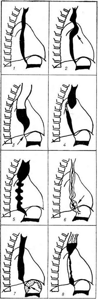 При дифференциальной диагностике заболеваний пищевода, сопровождающихся Дисфагия, должно быть учтено, что Дисфагия — частый симптом острого эзофагита (смотри полный свод знаний). При раке пищевода Дисфагия наблюдается у большинства больных, причём в 25% случаев она является первым симптомом заболевания. Относительно частые причины Дисфагия — инородные тела, внедрённые в стенку пищевода, в том числе мелкие (рыбьи кости и другие); грыжа пищеводного отверстия диафрагмы, осложнённая рефлюкс-эзофагитом или пептической язвой пищевода; ахалазия кардии (смотри полный свод знаний Кардиоспазм), стенозы пищевода после химических ожогов. В плане обследования при необходимости учитывают также возможность Дисфагия вследствие дистрофических изменений слизистой оболочки пищевода, наблюдающихся при железодефицитной анемии (сидеропеническая Дисфагия, или синдром Пламмера — Винсона), лейкозах, агранулоцитозе, пеллагре, при так называемый синдроме Шегрена (смотри полный свод знаний Шегрена синдром), а также кандидозное поражение пищевода вследствие бессистемной антибактериальной терапии (антибиотиками). При подозрении на органическую природу Дисфагия во всех случаях обязательно осуществляется целенаправленное рентгенологическое исследование пищевода и желудка, в ряде случаев показана фиброэзофагоскопия с биопсией (смотри полный свод знаний Эзофагоскопия). Лечение должно быть направлено на устранение основного заболевания. При тяжёлой степени Дисфагия органической природы и невозможности её причинного лечения в ряде случаев производится гастростомия (смотри полный свод знаний). Рентгенологическое исследование при дисфагии. Ввиду многочисленности причин Дисфагия рентгенологическое исследование должно проводиться целенаправленно, с достаточной полнотой путём рентгеноскопии и рентгенографии (рисунок 1). При необходимости применяются дополнительные методы исследования, как рентгенологическое, так и другие, в том числе радиоизотопное сканирование. С целью исследования функциональных изменений пищевода целесообразно применение рентгено-кинематографии (смотри полный свод знаний) или серийной крупнокадровой флюорографии (смотри полный свод знаний) через электронно-оптический усилитель и соответствующую камеру для снимков 70 × 70 миллиметров или 100 × 100 миллиметров. Для уточнения диагностики при интрамуральных опухолях методом выбора является париетография (смотри полный свод знаний) с наложением пневмомедиастинума (смотри полный свод знаний) в сочетании с томографией (смотри полный свод знаний). При подозрении на опухолевое сужение пищеводно-желудочного перехода целесообразно исследование в условиях пневмоперитонеума (смотри полный свод знаний). Как правило, в начале исследования применяют жидкую бариевую взвесь; только убедившись в том, что она свободно проходит по пищеводу, можно переходить к применению густой бариевой пасты. Во всех случаях следует применять полипозиционное исследование (смотри полный свод знаний) пищевода и желудка, которое позволяет увидеть ряд важных деталей (напр., изъязвление опухоли). Исследование рельефа слизистой оболочки пищевода проводят в горизонтальном положении пациента. Кардиальный отдел желудка при подозрении на грыжу пищеводного отверстия диафрагмы исследуют в положени