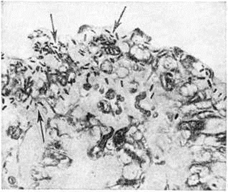В подслизистом и межмышечном нервных сплетениях толстого кишечника обнаруживаются дегенеративные изменения нейронов; их считают причиной замедленной регенерации дизентерийных язв. В других органах при Дизентерия обнаруживаются дистрофические изменения, объясняемые как нарушением питания (особенно при длительной болезни), так и действием бактериальных продуктов и других токсических веществ, проникающих через повреждённую слизистую оболочку кишки. С появлением химиотерапевтических препаратов направленного действия смертельные исходы и тяжёлые формы колита вообще почти не встречаются. С помощью методов морфологически исследований (иммуногистохимического, электронно-микроскопического и другие) удалось получить новые данные, важные для понимания патологический анатомии и патогенеза дизентерийной инфекции. Так, в эксперименте была установлена способность шигелл к паразитированию в эпителиальных клетках кишечника (рисунок 4). При этом покровные клетки, поражённые шигеллами, обнаруживаются только в очагах гнойного воспаления и отсутствуют в участках простого катара. По мере размножения микробов эпителиальные клетки разрушаются и слущиваются. В маленьких кусочках ткани, получаемых путём биопсии при катаральных колитах у человека, очажки воспаления с шигеллами в эпителии попадаются редко. ИммунитетОсобенности дизентерийной инфекции (склонность к переходу в хронический форму, частые рецидивы) способствовали тому, что вопрос о наличии иммунитета при этой болезни долгое время оставался спорным. Клинической, и экспериментальные наблюдения П. К. Лихторович и другие (1956), Н. А. Яхнина (1958), Хонжо (S. Honjo) с сотрудники (1967) и другие свидетельствуют о возникновении постинфекционного специфического иммунитета (смотри полный свод знаний) продолжительностью от 1—3 месяцев до 1 года. До 60-х годы вопросы специфического иммунитета при Дизентерия рассматривались исключительно в связи с функцией ретикулоэндотелиальной и мезенхимальной систем организма. Был накоплен большой материал, свидетельствующий о повышении в ходе болезни содержания сывороточных антител (агглютининов, преципитинов, комплементсвязывающих антител, гемагглютининов) и превентивной активности сыворотки крови, получены данные о накоплении в сыворотке крови больных Дизентерия бактериолизинов. Однако установлено, что уровень антител не определяет степени невосприимчивости организма к последующему заражению и в ряде случаев не соответствует тяжести болезни. При Дизентерия наряду с гуморальной усиливается клеточная защитная реакция. По мнению М. В. Войно-Ясенецкого (1963) и другие, захват и переваривание шигелл в слизистой оболочке кишечника в основном осуществляют полиморфно-ядерные лейкоциты. Такеути (A. Takeuchi, 1968) и сотрудники полагают, что в этом процессе участвуют также мононуклеары — тканевые макрофаги и гистиоциты. Более конкретны стали представления о местном иммунитете при дизентерии Преобладающее большинство работ по этому вопросу проведено на кератоконъюнктивальной модели (у морской свинки). По мнению Формала (S. Formal, 1966) и сотрудники и Ю. А. Белой (1970), местный иммунитет имеет в основном клеточно-тканевой характер. Другим вероятным механизмом местного иммунитета при Дизентерия является невосприимчивость самих эпителиальных клеток. Дизентери