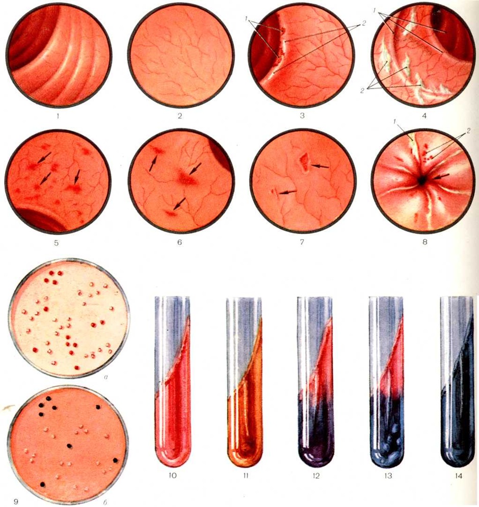 При острых дизентерийных колитах нарушения целости тканей и скопления полиморфно-ядерных лейкоцитов ограничены пределами собственно слизистой оболочки. В подслизистой основе обычно наблюдается лишь расширение кровеносных сосудов с миграцией полиморфно-ядерных лейкоцитов, а также возникает то более, то менее выраженный отёк, иногда с кровоизлияниями. При особо тяжёлых формах колитов, называемых дифтеритическими (цветной рисунок 3), на обширных участках слизистая оболочка почти полностью отсутствует, подслизистая основа очень сильно утолщена и пронизана густой сетью волокон фибрина с обильными кровоизлияниями. При благоприятном течении болезни воспалительный процесс в слизистой оболочке толстого кишечника стихает. Небольшие повреждения её эпителизируются, но в области более крупных дефектов слизистая оболочка некоторое время остаётся более низкой. Для затянувшихся тяжёлых колитов характерно образование язв (цветной рисунок 5, 9 и 10), нередко многочисленных и крупных. Края таких язв подрыты. При обширных язвах края их сливаются друг с другом. Однако дизентерийные язвы не глубоки, распространяются в пределах подслизистого слоя и в противоположность брюшнотифозным крайне редко ведут к перфорации. По той же причине рубцевание язв (цветной рисунок 4) редко вызывает сужение просвета кишки. Иногда наблюдается неправильная (избыточная) регенерация повреждённой слизистой оболочки с полипозными её разрастаниями (цветной рисунок 2). При затяжном и рецидивирующем течении Дизентерия в толстом кишечнике могут обнаруживаться разные по давности и по тяжести изменения. Обострение инфекции проявляется усилением катара и появлением новых очагов воспаления, часто на месте прежних, например, по краям язв. Тканевые изменения, присущие бактериальной Дизентерия, наиболее резко выражены в прямой, сигмовидной и нисходящей кишках, но не менее тяжёлыми они могут быть и в других отделах кишечника, подчас захватывая даже терминальные участки тонкой кишки. Поражения, как правило, имеют локальный характер и часто чередуются с мало изменёнными участками слизистой оболочки; сильнее всего страдают вершины складок. Выраженность и некоторые морфологически особенности поражения кишечника позволяют различать следующие основные формы дизентерийного колита.Катаральный колит проявляется набуханием и гиперемией слизистой оболочки толстого кишечника, нередко покрытой слизью и мутной или гноевидной жидкостью. При исследовании через ректоскоп и на вскрытиях изменения слизистой оболочки представляются распространенными и довольно однородными, лишь кое-где удаётся различить мелкие кровоизлияния и эрозии (катарально-геморрагическая форма — цветной рисунок 6) или заметить незначительные плёнчатые экссудативные наложения. Степень выраженности катарального колита бывает разной — от лёгкого набухания и розовой окраски слизистой оболочки прямой и сигмовидной кишок до резко выраженного катара, захватывающего всю толстую кишку. При катаральном колите у маленьких детей с сильно развитым лимфатический, аппаратом иногда над поверхностью слизистой оболочки отчётливо выступают крупные солитарные фолликулы, окаймлённые узким пояском гиперемии. Однако обособлять такой колит, называя его фолликулярным, нет оснований, тем более, что при Дизен