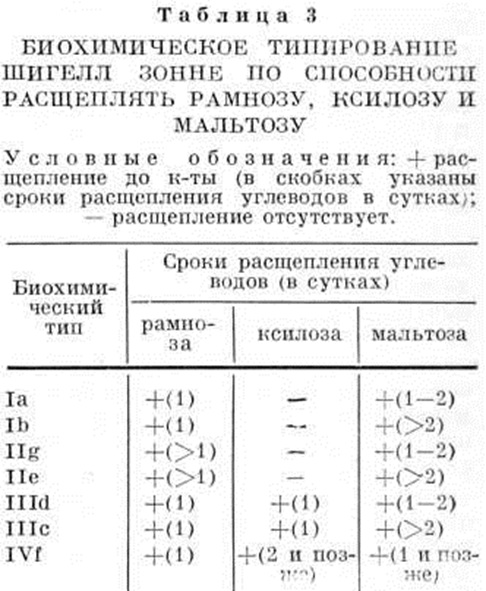 Шигеллы Ньюкасл в зависимости от характера расщепления глюкозы, маннита и дульцита подразделяются по Эдвардсу и Юингу (P. R. Edwards, W. Н. Ewing, 1962) на 7 биохимический типов (таблица 4). Для ускоренной диагностики Дизентерия применяют метод флюоресцирующих антител (смотри полный свод знаний Иммунофлюоресценция). При диагностике применяют также иммуно л. реакции, основанные на обнаружении антител к возбудителю. Специфические антитела в сыворотке крови больного при острой Дизентерия обнаруживают с 5—8-го дня болезни с последующим нарастанием их содержания к 15—20-му дню. Наиболее достоверные результаты получают при изучении парных сывороток крови больных, взятых дважды с целью выявления динамики титра антител. Для диагностики Дизентерия можно использовать чувствительную и специфическую реакцию пассивной гемагглютипации (смотри полный свод знаний) с эритроцитарными диагностикумами из шигелл Зонне и Флекснера; гемагглютинины обнаруживаются в сыворотке крови больных Дизентерия в течение 3 месяцев. Диагностическим является титр 1 : 200.