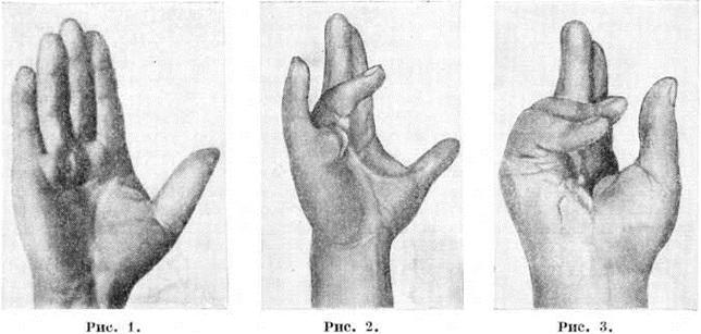 Диагноз ставится на основании характерных изменений в области ладони и контрактуры пальцев.