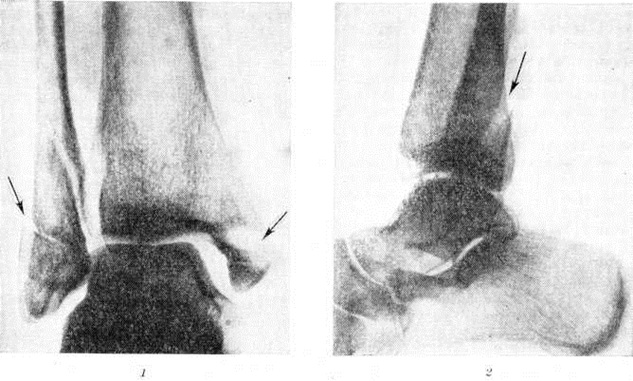 На рентгенограмме в прямой проекции при Дюпюитрена перелом хорошо видна линия перелома медиальной лодыжки, обычно проходящая на уровне суставной щели, а также латеральной лодыжки на уровне суставной щели или выше неё. Вместе с тем отчётливо выступают смещение отломков и возможный диастаз, то есть расхождение «вилки» сустава (рисунок 1 и 2). Для диагностики разрыва нижнего межберцового синдесмоза большое значение имеет сравнительное изучение переднезадних снимков (сделанных на одной плёнке) обоих голеностопных суставов в обычной укладке или с симметричной внутренней ротацией на 27°.
