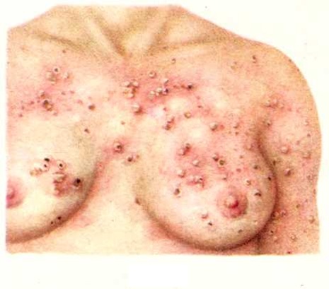 Под влиянием расчёсов пузыри лопаются, содержимое их ссыхается в корочки. Нередко одновременно наблюдаются пузырные, уртикарные, пустулёзные элементы как в свежем, так и в регрессивном состоянии; на местах бывших элементов остаются пигментированные, а иногда и депигментированные участки. Высыпания на слизистой оболочке полости рта наблюдаются редко.