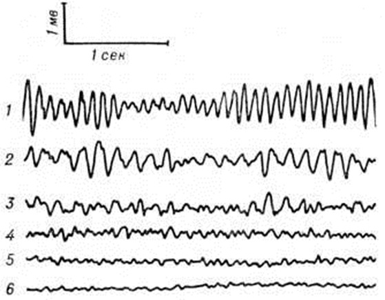 Клинические, картина Фибрилляция желудочков сердца характеризуется потерей сознания, отсутствием пульса на периферических и центральных артериях, максимальным расширением зрачков, появлением дыхания агонального типа, а затем и его прекращением (смотри полный свод знаний: Терминальные состояния). Фибрилляция желудочков сердца за редкими исключениями является состоянием спонтанно необратимым и неминуемо ведёт к гибели организма, если не будут приняты меры к немедленному её устранению. Если Фибрилляция желудочков сердца возникает не во время торакотомии, когда за состоянием сердца можно наблюдать визуально, достоверный диагноз Фибрилляция желудочков сердца возможен лишь при электрокардиографии; ЭКГ в этих случаях характеризуется стадийностью, отражающей степень гипоксии и метаболических изменений в миокарде. В характеристике каждой стадии (рисунок) имеет значение вид и соотношение фибриллярных осцилляций — ритмичных изоморфных и аритмичных полиморфных. Абсолютно чётких границ между стадиями не существует.