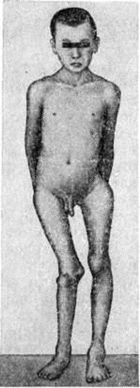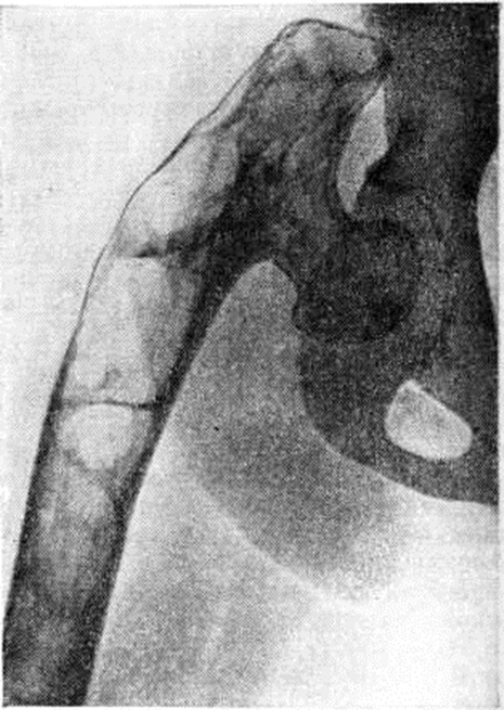 Отдельные кости подвергаются характерной деформации (рисунок 2). При локализации очага Фиброзная остеодисплазия в проксимальном конце бедра оно приобретает вид пастушьей палки с изгибом выпуклостью кнаружи, большой вертел поднимается вверх на уровень тела подвздошной кости; развивается варусная деформация бедра. Голени при их поражении изгибаются чаще кнаружи и кпереди. Плечевые кости булавовидно утолщаются в проксимальных отделах. Поражение костей таза сопровождается деформацией тазового кольца, позвонков, рёбер, грудной клетки. Поражение костей черепа и их деформация вызывают асимметрию и обезображивание лица, вторичные нарушения зрения и слуха, головные боли, экзофтальм (смотри полный свод знаний). Деформации костей усугубляются неправильно сросшимися патологический переломами. Почти постоянным симптомом Фиброзная остеодисплазия костей нижней конечности является хромота (смотри полный свод знаний), от лёгкого прихрамывания до выраженного нарушения походки. Функциональная неполноценность конечности сопровождается атрофией мягких тканей, вторичными деформациями суставов, позвоночника. Полиоссальная форма Фиброзная остеодисплазия часто сочетается с патологический кожной пигментацией (пятна различной величины и формы всех оттенков коричневого цвета), ранним половым созреванием (смотри полный свод знаний), гипертиреозом (смотри полный свод знаний: Тиреотоксикоз). Костные изменения, пигментация кожи и преждевременное половое созревание у женщин — триада признаков, известных как синдром, или болезнь, Олбрайта (смотри полный свод знаний: Псевдогипопаратиреоз). Прогрессирование Фиброзная остеодисплазия заканчивается с половым созреванием. Диагноз устанавливают на основании клинические, картины и типичных рентгенологическое данных. Ведущими рентгенологическое признаками Фиброзная остеодисплазия являются очаг разрежения и зона диффузного просветления костной ткани. В соответствии с этим принято различать две рентгенологическое формы Фиброзная остеодисплазия: очаговую и диффузную. Граница между ними, однако, не всегда отчётлива, возможны смешанные формы. При очаговой форме Фиброзная остеодисплазия обнаруживают участки ограниченного просветления костной ткани, располагающиеся эксцентрически в области коркового (компактного) вещества кости. Первоначально возникающие узлы чётко отграничены друг от друга скорлупообразной уплотнённой полоской костной ткани. По мере развития заболевания размеры очагов увеличиваются; обнаруживается истончение коркового вещества, которое приобретает неровные серповидные или фестончатые очертания. Кость как бы вздувается изнутри, становится бугристой. Иногда выявляют одновременно несколько изолированных очагов Фиброзная остеодисплазия, которые нечётко отграничены друг от друга, но все же сохраняют относительную самостоятельность; при этом кость приобретает крупноячеистый вид (рисунок 3). Корковое вещество её резко истончается за счёт эндостальной резорбции. Поперечник кости на значительном протяжении неравномерно утолщается. В некоторых случаях очаги Фиброзная остеодисплазия определяются в виде отдельных гнездных образований, разбросанных по длиннику кости среди неизменённой или малоизменённой, в основном склерозированной, костной ткани. Структур