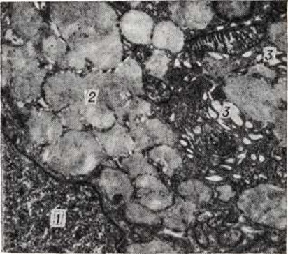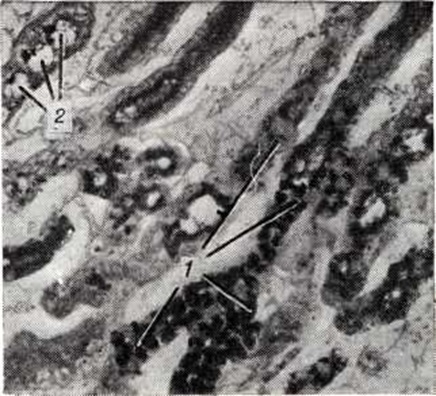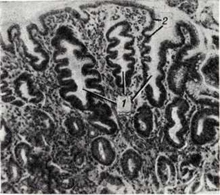 При хроническом гастрите с поражением желёз поверхностный эпителий слизистой оболочки уплощён, отмечается углубление желудочных ямочек, добавочные гландулоциты гиперплазированы. В главных гландулоцитах выявляются вакуоли (рисунок 1), содержащие нейтральные мукополисахариды (цветной рисунок 5). В цитоплазме этих клеток, среди гранул зимогена, обнаруживаются бесформенные массы, местами окружённые мембраной. Эти массы сходны с «незрелым» или «зрелым» мукоидом. В надъядерной зоне выявляется развитый пластинчатый комплекс (Гольджи) с расширенными цистернами (рисунок 2). Таким образом, в этих клетках обнаруживаются элементы как главных (зимоген, РНК, эргастоплазма), так и добавочных гландулоцитов (нейтральные мукополисахариды, хорошо развитый пластинчатый комплекс). Эти клетки являются, по-видимому, незрелыми главными гландулоцитами перешеечного отдела желудочных желёз. В результате замедления их дифференциации они занимают территорию зрелых главных гландулоцитов. Добавочные гландулоциты также «незрелые», с развитым пластинчатым комплексом и эргастоплазмой; обнаруживаются они в тех отделах желёз, где обычно не наблюдаются. Хронический атрофический гастрит характеризуется уменьшением (иногда значительным) числа главных и добавочных гландулоцитов, углублением желудочных ямочек (цветной рисунок 7 и цветной рисунок 6 и 7), которые часто имеют штопорообразный вид (рисунок 3), гиперплазией добавочных гландулоцитов. Эпителий, покрывающий желудочные поля и ямочки, нередко уплощён, содержит много РНК и мало нейтральных мукополисахаридов, местами замещён кишечным эпителием (цветной рисунок 8) с типичными энтероцитами, бокаловидными клетками и клетками Панета (кишечная метаплазия). Желудочные железы нередко заменены слизистыми (пилорическая метаплазия). Сохранившиеся главные гландулоциты вакуолизированы, в обкладочных гландулоцитах выявляется разрежение цитоплазмы в перинуклеарной зоне и вокруг внутриклеточных канальцев, а также уменьшение количества микроворсинок и тубуловезикул; отмечается редукция крист митохондрий обкладочных гландулоцитов. Вольф (G. Wolf, 1968) выделяет три стадии атрофии слизистой оболочки желудка: начинающуюся атрофию, при которой железы ещё не укорочены, но выглядят как бы сдавленными; частичную атрофию (желёз), при к-рой сохранены группы желёз, содержащие главные и париетальные (обкладочные) гландулоциты; тотальную атрофию желёз (атрофия слизистой оболочки), когда главные и париетальные (обкладочные) гландулоциты не выявляются, железы выстланы только слизеобразующим эпителием. Хронический гипертрофический гастрит — утолщение слизистой оболочки и усиленная пролиферация эпителия (цветной рисунок 6, 9 и рисунок 7). Различают три формы хронический гипертрофического Гастрит: интерстициальную, пролиферативную, железистую. Для интерстициальной формы характерна обильная лимфоплазмоцитарная инфильтрация, встречающаяся в краях язв; для пролиферативной — разрастание поверхностного эпителия, углубление ямочек, железистый аппарат без изменений; при железистой форме слизистая оболочка утолщена в 2—7 раз за счет гиперплазии желёз; эта форма хронический Гастрит встречается при язве двенадцатиперстной кишки (смотри Язвенная болезнь), синдроме Золлингера — Эллисона (смотри Золлингера — Эллисона си