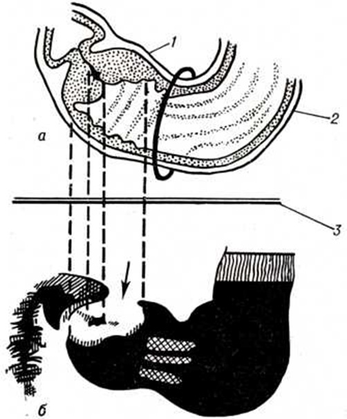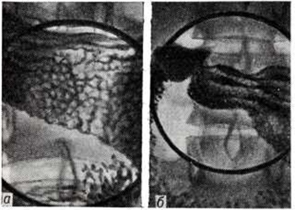 Ригидный гастрит впервые описан А. Н. Рыжих и Ю. Н. Соколовым (1947). Он проявляется упорной диспепсией (смотри) и ахлоргидрией (смотри). Диагноз устанавливается при рентгенологическое исследовании и на основании данных гастроскопии. Преимущественно поражается выходной отдел желудка, который вследствие гипертрофических изменений, отёка и спастического сокращения мускулатуры деформируется, превращаясь в узкий трубообразный канал с плотными ригидными стенками. Полипозный гастрит (цветной рисунок 8) развивается обычно на фоне атрофического Гастрит с гистаминрефрактерной ахлоргидрией, его можно рассматривать как дальнейшее прогрессирование хронический Гастрит (дисрегенераторная гиперплазия слизистой оболочки). Гигантский гипертрофический гастрит или точнее избыточное развитие слизистой оболочки, описанный Менетрие (P. Menetrier, 1886),— относительно редкое заболевание, проявляющееся нарушением обмена веществ (чаще белкового) и очень редко развитием железодефицитной анемии. Изменение кислотообразующей функции желудка бывает различным (смотри также таблица). Диагноз основывается на анализе клин, проявлений болезни, результатах исследования желудочной секреции (смотри Желудок, методы исследования), рентгенологическое исследования, данных гастроскопии (смотри) и гастробиопсии. В оценке морфологически картины слизистой оболочки желудка следует отдавать предпочтение данным гастробиопсии. Эксфолиативная цитодиагностика, определение всасывательной и экскреторной функции желудка имеют второстепенное значение. Определённые трудности возникают при дифференциальной диагностике с функциональными нарушениями желудка, раком желудка (смотри Желудок, опухоли) и язвенной болезнью (смотри). При функциональных нарушениях желудка обычно нет резких морфологически изменений. Кроме того, они имеют относительно кратковременное (до 1 года) течение, меньшую зависимость возникновения болей от приёма пищи, большую изменчивость клинической проявлений, что связано с нервно-психическими влияниями, атипичную локализацию болезненности при пальпации живота и, наконец, резкое колебание кислотности при отдельных исследованиях. Рентгенодиагностика основывается на тщательном рентгенологическое исследовании желудка. При этом определяются перестройки рельефа слизистой оболочки желудка и другие рентгено-функциональные и морфологически симптомы. К ним относятся: избыточная секреция натощак, быстрое нарастание секреторной жидкости, изменения тонуса, стойкая деформация привратниковой части желудка, нарушение перистальтики и другие. Наиболее постоянен симптом увеличенной секреции натощак, проявляющийся иногда горизонтальным уровнем жидкости на фоне желудочного пузыря до приёма бариевой взвеси. Первые один-два глотка взвеси бария подтверждают наличие избытка жидкости. По характеру смешивания бария с жидкостью можно до известной степени судить о количестве содержащейся в ней слизи: медленное смешивание с образованием бесформенных хлопьев указывает на наличие слизи. Другим симптомом наличия слизи (феномен слизи) являются мелкоточечные просветления в слое бариевой взвеси — мельчайшие капельки слизи, взвешенные в суспензии бария. Феномен слизи неразличим при просвечивании и может быть констатирован только на снимках с компрессие