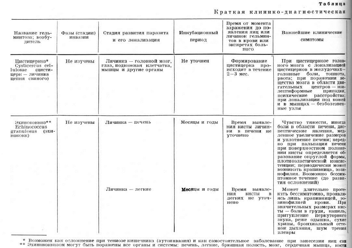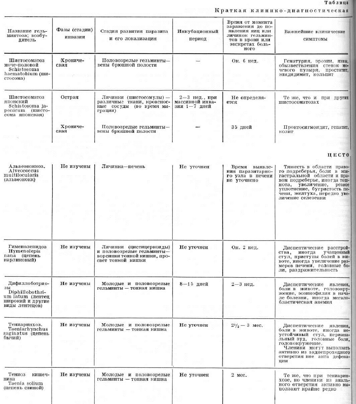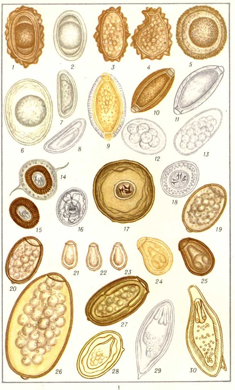 Широкое распространение Гельминтозы в тропической зоне объясняется и относительно низким экономическим уровнем, недостаточной организацией лечебно-профилактические по мощи населению в развивающихся странах. Гименолепидоз и энтеробиоз распространены повсеместно. ЭтиологияВажнейшие Гельминтозы человека вызываются паразитическими червями, относящимися к классам Trematoda (сосальщики), Cestoda (ленточные черви) и Nematoda (круглые черви). В соответствии с этим различают трематодозы (смотри), цестодозы (смотри), нематодозы (смотри). Известны случаи паразитирования у человека червей типа Annelida (кольчатые черви) и Acanthocephala — скребни, или колючеголовые (смотри Акантоцефалезы). ЭпидемиологияИсточником заражения Гельминтозы является человек, а при гельминтозоонозах также домашние и дикие животные. В зависимости от факторов передачи Гельминтозы разделяют на две основные группы: геогельминтозы и биогельминтозы. Яйца или личинки возбудителей геогельминтозов выделяются больным с фекалиями во внешнюю среду, где они созревают и становятся инвазионными. Факторами передачи служат загрязнённые личинками или яйцами геогельминтов почва, вода, пища, игрушки, предметы обихода и руки. К геогельминтозам относятся аскаридоз, трихоцефалез, анкилостомидозы, стронгилоидоз и другие. Возбудители биогельминтозов в своём развитии, помимо окончательного (дефинитивного) хозяина, нуждаются в промежуточном, а иногда и дополнительном хозяине, в организме которых паразитируют личиночные стадии гельминтов (смотри Хозяин паразита). В организме дефинитивных хозяев биогельминты достигают половой зрелости. Например, дефинитивным хозяином возбудителя тениаринхоза — бычьего цепня — является человек, промежуточным хозяином — крупный рогатый скот. Больной тениаринхозом выделяет с фекалиями яйца и членики бычьего цепня, содержащие большое количество зрелых яиц. У животного, проглотившего яйца бычьего цепня с кормом или водой, в мышцах развиваются личинки — цистицерки (финны). Человек заражается тениаринхозом при употреблении в пищу сырого или недостаточно термически обработанного финнозного мяса. Возбудитель дифиллоботриоза — широкий лентец, кроме дефинитивных хозяев — человека, кошки, собаки и другие, имеет хозяев промежуточных (рачков-циклопов и другие.) и дополнительных (рыб — щуку, окуня, налима и другие.). Заражение дифиллоботриозом происходит при употреблении в пищу сырой или недостаточно термически обработанной рыбы либо не просоленной икры с личинками лентеца. К биогельминтозам также относятся тениоз, описторхоз, клонорхоз, метагонимоз, парагонимоз, фасциолез, фасциолопсидоз, дикроцелиоз, шистосоматозы, филяриатозы, трихинеллёз и другие. Для трихинеллы характерно, что все стадии её развития проходят в одном хозяине — человеке, домашних и диких млеко питающих. Для возбудителя же гименолепидоза — карликового цепня — дефинитивным и промежуточным хозяином является человек: половозрелые гельминты паразитируют в просвете кишечника, личинки — в ворсинках. Гельминтозы, возбудители которых могут паразитировать и у человека, и у животных, называют гельминтозоонозами. К ним относятся трихинеллёз, эхинококкоз, альвеококкоз, описторхоз, клонорхоз, фасциолез, японский шистосоматоз, бругиоз и другие. Гельминтозоонозы, которые существуют и распростра