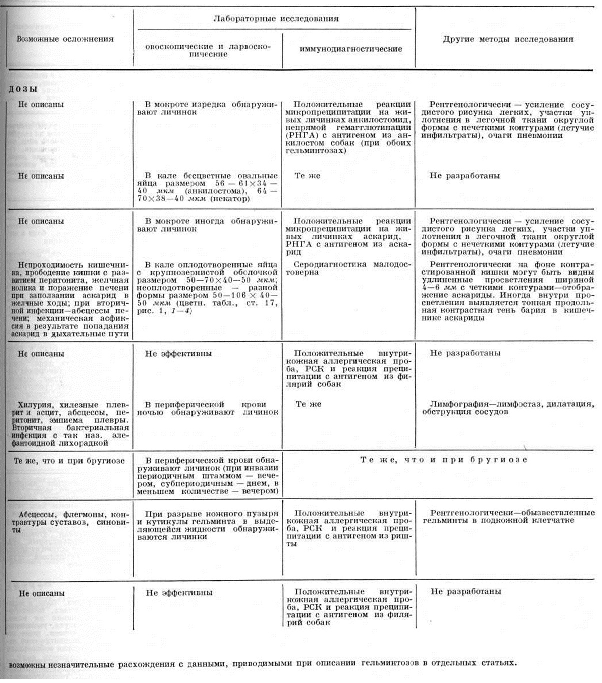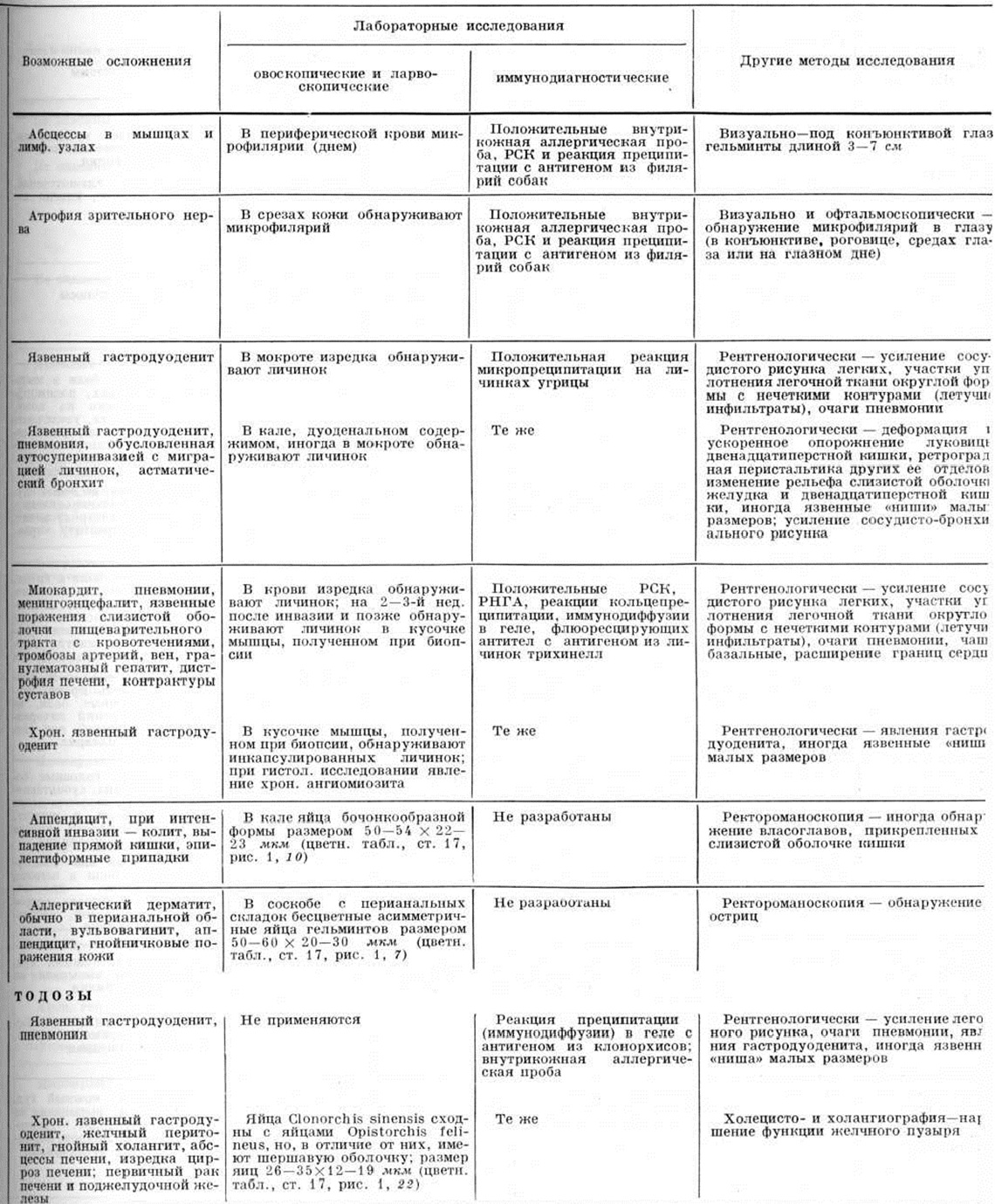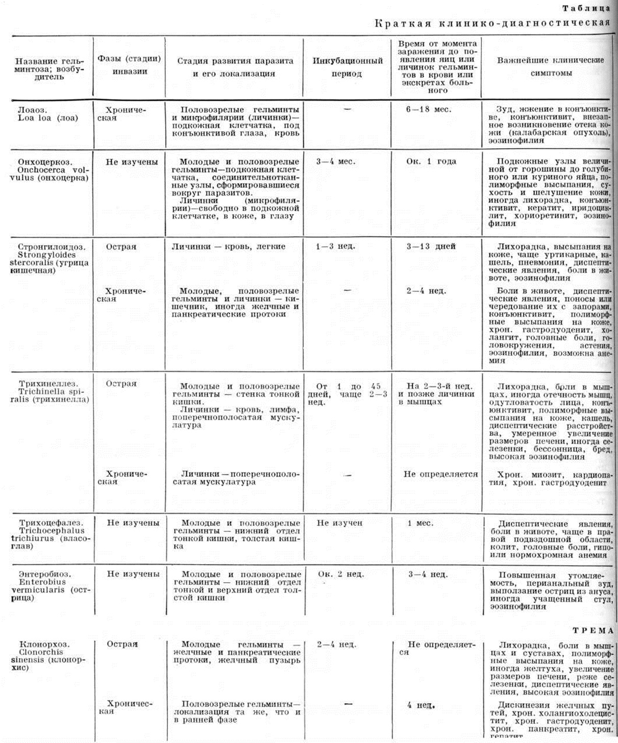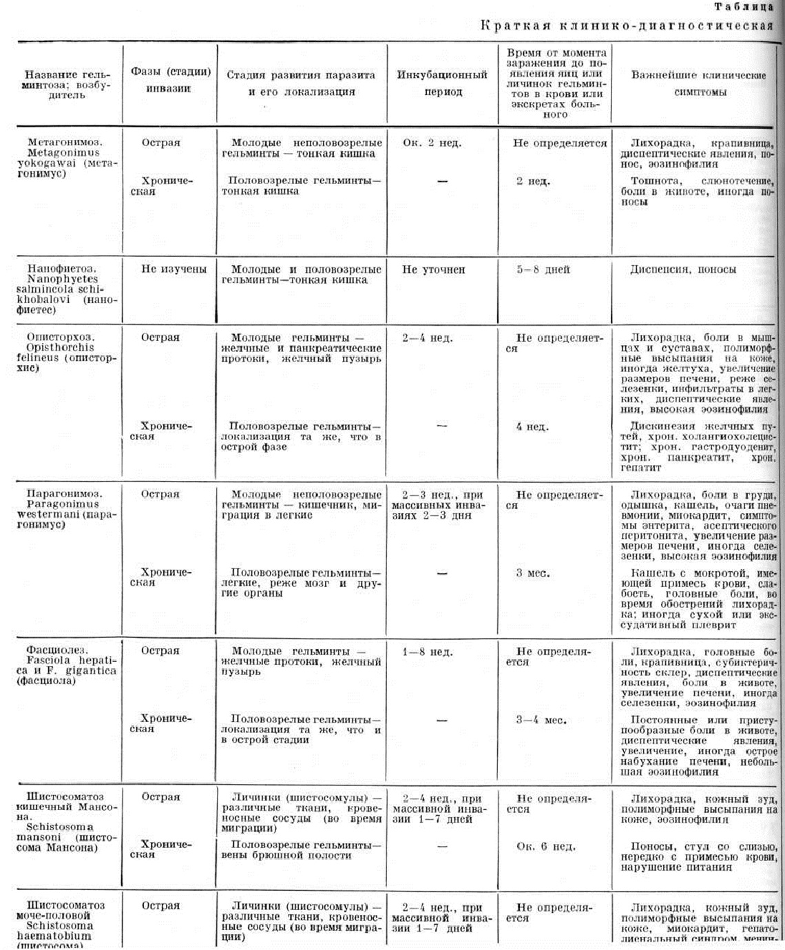 При Гельминтозы, возбудители которых повторно откладывают живых личинок, например, при стронгилоидозе, филяриатозах, общеаллергические явления закономерно возникают и в хронический фазе болезни. Крапивница, гиперэозинофилия крови, анафилактические реакции особенно характерны для ларвальных (личиночных) Гельминтозы, при которых человек является промежуточным хозяином, например, для эхинококкоза, larva migrans (смотри). Существенную роль в патогенезе Гельминтозы играет диспротеиноз и тяжёлые дистрофические процессы, развивающиеся в результате массивного антигенного воздействия паразитов на организм хозяина (жировая дистрофия печени при трихинеллёзе, системный амилоидоз при альвеококкозе и множественном эхинококкозе печени и другие.). Помимо иммунологический механизмов, к неспецифическим факторам воздействия гельминтов следует отнести прямое действие ферментов, выделяемых мигрирующими личинками, — гиалуронидазы, коллагеназы, холинэстеразы, пептидаз, липолитических ферментов. В хронический фазе Гельминтозы наряду с сенсибилизирующим воздействием паразитов на организм существенную роль играет механический фактор, например, нарушение оттока желчи при размещении кисты эхинококка или узла альвеококка в воротах печени, окклюзионный синдром при перемещении цистицерков в желудочках мозга, травматизация слизистой оболочки кишечника фиксирующим аппаратом гельминтов. К специфическому воздействию гельминтов следует отнести способность широкого лентеца поглощать из кишечника хозяина витамин В12, при кровососании — кровь, кислород и железо, что служит причиной развития пернициозоподобной анемии, а также заимствование гельминтами кислорода и железа в процессе окислительного фосфорилирования. Течение заболевания при Гельминтозы за висит от массивности инвазии, штаммовых особенностей паразитов, общего состояния организма хозяина, особенностей его профессии, определяющих нередко путь заражения Гельминтозы. Отягощающее влияние Гельминтозы на течение инфекций вызвано действием антигенов гельминтов, что способствует, с одной стороны, сенсибилизации (смотри), а с другой стороны, подавлению формирования иммунитета. Патологическая анатомияПатоморфологические изменения во внутренних органах в острой Гельминтозы характеризуются пролиферацией лимфоидных элементов, макро фагов, плазматических, тучных клеток, гранулематозом, эозинофильной реакцией, васкулитами. При ранних летальных исходах (2—3 недель после заражения) преобладают геморрагически-альтеративные поражения, в более поздние сроки (4— 6 недель) — гранулематоз или диффузная эозинофильная инфильтрация поражённого органа (миокардит, пневмонит, гепатит, энцефалит), системные васкулиты, тромбогеморрагический синдром. ИммунитетЗаболевание Гельминтозы вызывает у человека и животных специфические защитные реакции клеточного и гуморального характера. Иммунитет (смотри) при Гельминтозы проявляется ограничением репродуктивной активности и удалением из кишечника зрелых гельминтов (аскарид, трихинелл и другие.), подавлением жизнеспособности, гибелью и резорбцией тканевых личиночных форм (трихинелл, эхинококков, альвеококков), невосприимчивостью к суперинвазии. Антитела при Гельминтозы высокоспецифичны не только по отношению к видам, но также и стадиям р