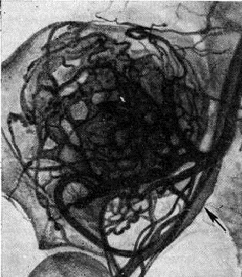 Нередко вторичное вовлечение кости при первичной Гемангиома мягких тканей (рисунок 3); на фоне клинически и рентгенологически выявляемого увеличения объёма мягких тканей определяются типичные мелкие (костной плотности) образования — ангиолиты. Иногда наблюдается истончение участка кости, соприкасающегося с опухолью от давления, причём остеопороз, как правило, отсутствует. При прорастании Гемангиома в кость в зоне её внедрения наблюдается развитие центральных и краевых дефектов, окружённых склеротической каймой. При Гемангиома мягких тканей предплечья и голени обычно наблюдается вовлечение в процесс обеих костей на уровне локализации Гемангиома. Рентгенологическое исследование подтверждает диагноз Гемангиома, выявляя в мягких тканях характерные тени ангиолитов. Дифференциально-диагностические трудности, возникающие при глубоком расположении Гемангиома в мягких тканях, могут быть разрешены при помощи ангиографии (рисунок 4). ЛечениеПри Гемангиома с прогрессирующим течением применяются следую щие методы лечения: хирургический, криотерапия, инъекции склерозирующих веществ, электрокоагуляция, лучевая терапия. Хирургический метод лечения наиболее распространён и чаще применяется при Гемангиома кожи и под кожной клетчатки туловища и конечностей; он также используется в ряде случаев при Гемангиома мышц и внутренних органов (печень, кишечник и другие.). Гемангиома, как правило, должна удаляться в раннем детском возрасте, пока она ещё не разрослась. Раннее иссечение опухоли даёт хороший косметический результат и позволяет избежать осложнений в виде изъязвлений и инфекции. Применяют следующие виды хирургического лечения: иссечение Гемангиома, частичное удаление её с наложением швов через кожу. Иссечение является наиболее простым и радикальным методом. Операция показана в тех случаях, когда её можно выполнить без косметического дефекта и риска нарушить функции органа или конечности. В зависимости от локализации очага поражения и его размеров оперативное вмешательство производится под местной анестезией либо под наркозом. Очерчивающим разрезом (чаще овальным) Гемангиома иссекают вместе с прилежащей клетчаткой. При иссечении Гемангиома, располагающейся на конечностях, целесообразно пользоваться жгутом. В тех случаях, когда жгут наложить не возможно, помощник прижимает края раны для уменьшения кровотечения. Кровотечение бывает особенно сильным в тех случаях, когда разрез прошёл в пределах опухоли. При расположении Гемангиома в клетчатке целесообразно иссекать её из-под кожи, стараясь сохранить последнюю. Такой приём позволяет избежать натяжения кожи во время зашивания и даёт хороший косметический результат. При больших Гемангиома образующийся после иссечения дефект закрывают свободной кожной пластикой. При значительных кровопотерях переливают кровь.