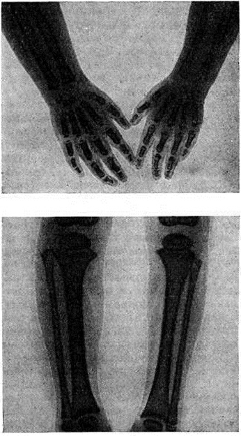 Атрофии могут распространяться на туловище и конечности одноименной или противоположной стороны — тотальная гемиатрофия (рисунок 1). На ЭЭГ регистрируются признаки поражения гипоталамо-мезэнцефальных образований головного мозга. При рентгенологическое исследовании костей поражённой стороны выявляются их истончение (рисунок 2) и остеопороз (смотри).