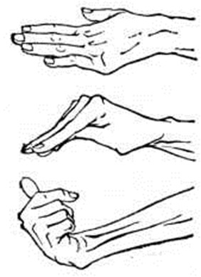 Прогрессирующая гемиплегия возникает при протрагированном течении патологический процесса. Для неё характерны вынужденное положение конечностей, контрактуры, различные по форме (сгибательные, разгибательные, пронаторные), по локализации (контрактуры кисти, стопы), по способу проявления (стойкие, в виде тонических спазмов), по времени возникновения (ранние и поздние). Гиперпронаторная контрактура характеризуется гемигиперпронацией кисти с разгибанием или чрезмерным сгибанием пальцев, резкой гипертонией в пронаторах (рисунок 3). Гиперсупинаторная контрактура парализованной руки характеризуется чрезмерной супинацией предплечья и кисти. Своеобразные контрактуры с вычурной позой конечностей наблюдаются при поражении подкорковых узлов: указательная контрактура (указательного и среднего пальцев); «таламическая» кисть с гиперэкстензией пальцев в основных фалангах; гиперсупинаторная контрактура с резкой супинацией стопы; гемифлексорная гемиплегическая контрактура (сгибание верхней и нижней конечностей на парализованной стороне) в сочетании со сгибанием голени и бедра, абдукцией или реже гипер аддукцией. К поздним гемиплегическим контрактурам относится контрактура Вернике — Манна, возникающая вследствие длительного сохранения позы Вернике — Манна: верхняя конечность приведена к туловищу, надплечье опущено, предплечье согнуто, пронировано, кисть и пальцы умеренно согнуты, нижняя конечность приведена, бедро и голень разогнуты, стопа повёрнута внутрь. Регрессирующая гемиплегия проявляется в реституционном периоде заболевания. Она характеризуется последовательным восстановлением нарушенных движений. Функция парализованной ноги обычно восстанавливается быстрее, чем руки, движения в проксимальном отделе конечностей появляются раньше, чем в дистальном. Особенно поздно идёт восстановление наиболее дифференцированных движений пальцев руки. Функция разгибания кисти и пальцев значительно отстаёт от сгибательной, в результате чего преобладают сгибательные синергии при содружественных движениях и сгибательная поза при контрактурах. Движения в проксимальном отделе восстанавливаются довольно быстро, поскольку в реализации их участвует не только пирамидная, но и экстрапирамидная система. Походка при спастической регрессирующей Гемиплегия своеобразна: нога заносится вперёд и кнаружи, как бы описывая полукруг или движение, которое делает косарь («косящая походка»), стопа при этом находится в разогнутом положении и при ходьбе носком задевает за пол. Восстанавливающиеся нарушенные движения вначале бывают дискоординированными, выполняются с усилием и сопровождаются синкинезиями. В процессе восстановления моторики вначале нарастает тонус мышц, появляются содружественные движения в этих мышцах. Раньше появляются синкинезии: сгибание и пронация кисти, предплечья (рисунок 4) и отведение руки и разгибание бедра, голени и стопы. Затем появляются содружественные движения стопы (синкинезия Штрюмпелля) или большого пальца (синкинезия Логра) при попытке больного активно согнуть ногу в коленном суставе, аддукторная и абдукторная синкинезии Раймиста, сгибание голени на стороне Гемиплегия при наклоне туловища вперёд и другие синкинезии.