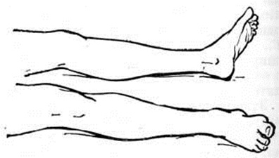 Капсулярная гемиплегия при поражении внутренней капсулы характеризуется сочетанием Гемиплегия с гемианестезией, иногда с гомонимной гемианопсией (смотри), стойкостью паралича, медленным и неполным восстановлением нарушенных функций. Альтернирующая гемиплегия проявляется поражением черепных нервов на стороне очага и Гемиплегия на противоположной стороне (смотри Альтернирующие синдромы). Альтернирующая оптико-пирамидная гемиплегия возникает в результате окклюзии сонной артерии. Проявляется слепотой на один глаз и Гемиплегия на противоположной стороне. Перекрёстная гемиплегия возникает при поражении перекрёста пирамид в нижнем отделе продолговатого мозга. Спинальная гемиплегия наблюдается при поражении спинного мозга и отличается от церебральных форм отсутствием нарушения функций черепных нервов. Гемиплегия бывает при половинном поражении спинного мозга (смотри Броун-Секара синдром), при локализации очага в верхнем шейном отделе спинного мозга (при поражении нижнего шейного и верхнего грудного отделов спинного мозга развивается вялый парез руки и спастический паралич ноги). В зависимости от стадии патологический процесса выделяются следующие формы Гемиплегия. Диасхизальная гемиплегия возникает в остром периоде комы, обусловливается не только очаговым поражением мозга, но «нервным шоком» или транснейрональной реперкуссивной асинапсией (смотри Диасхиз). Характерна гипотония мышц с отсутствием обычной для Гемиплегия спастичности. Наблюдается симптом ротации стопы кнаружи (рисунок 2); изменить положение парализованной стопы и принять ту позу, в которой находится здоровая стопа, невозможно. Характерен симптом гипотонии века на стороне Гемиплегия, заключающийся в том, что парализованное верхнее веко может быть поднято без всякого сопротивления и опускается медленно, не закрывая полностью глазное яблоко. На стороне Гемиплегия «парусит» щека при каждом выдохе, кожные (брюшной, подошвенный), корнеальный рефлексы отсутствуют, сухожильные рефлексы снижены при наличии патологический рефлекса Бабинского и защитных сгибательных рефлексов с укорочением (сгибанием) ноги в трёх суставах. Иногда на стороне очага поражения наблюдается защитно-рефлекторная реакция конечностей при раздражении, нанесённом на стороне Гемиплегия, и автоматизированная жестикуляция. В остром периоде апоплектической комы при Гемиплегия могут наблюдаться ранние гиперкинезы, ранний клонус стопы и коленной чашечки, насильственные изменения положения конечностей — горметония, или нестойкая ранняя мышечная гипертония.