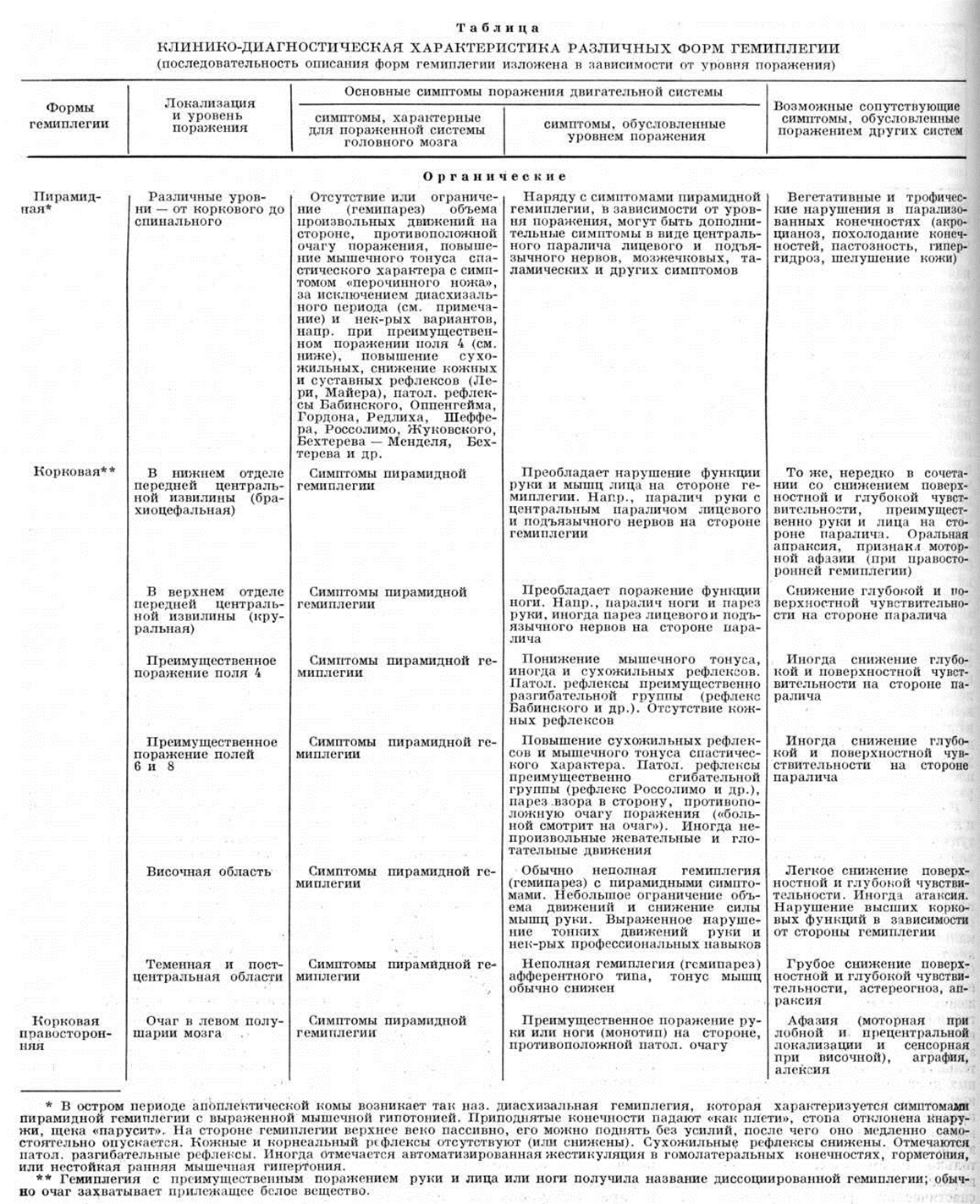 На ЭМГ обнаруживаются изменения, характерные для центрального паралича, при исследовании электровозбудимости отсутствует реакция перерождения. При длительно существующей Гемиплегия развивается нерезкая атрофия мышц. Наблюдаются также вегетативные расстройства (вазомоторные, трофические, пиломоторные, нарушение кожной температуры, потоотделения и другие.). В гемиплегический и гемипаретический симптомокомплексы входят ограничение или отсутствие движений, снижение силы мышц, изменение мышечного тонуса, патологический синкинезии и защитные рефлексы. Гемиплегия имеет различные варианты в зависимости от локализации поражения (таблица), стадии и характера патологический процесса и этиологии заболевания. Развитие Гемиплегия и выраженность нарушения двигательных функций и их динамика зависят от величины и глубины повреждения пирамидной системы и компенсаторных возможностей. Чем ограниченнее очаг поражения и чем ближе он расположен к коре, тем больше условий для появления пареза, а не паралича. В зависимости от локализации поражения различают следующие формы Гемиплегия. Корковая гемиплегия возникает при поражении двигательной области коры головного мозга; при поражении верхнего отдела передней центральной извилины и парацентральной дольки (круральная Гемиплегия) преимущественно нарушается функция ноги, при поражении нижнего отдела — функция руки и мышц лица и языка (брахиоцефальная Гемиплегия). В этих случаях можно говорить о гемипарезе, поскольку полного паралича не наблюдается. При поражении верхних двух слоёв коры в области передней центральной извилины возникает супрануклеарная Гемиплегия, которая характеризуется быстрым восстановлением функций. При поражении всех шести слоёв Гемиплегия бывает более выражена, и восстановление происходит медленнее. Корковая Гемиплегия, возникающая при поражении премоторной области, характеризуется ранней спастичностью, сухожильной гиперрефлексией, клонусом стопы, кисти, пальцев, глобальной синкинезией, ротацией стопы внутрь, координаторными синкинезиями, рефлексом Россолимо, шейно-тоническими рефлексами и другие, реституция идёт быстрее, чем при поражении поля 4. Правосторонняя корковая Гемиплегия при распространении поражения на задний отдел лобной доли или височную долю левого полушария сочетается нередко с нарушением речи и письма (у правшей). Супракапсулярная гемиплегия отличается склонностью к диссоциированному типу при локализации очага вблизи коры больших полушарий и относительно равномерным поражением руки и ноги при локализации очага ближе к внутренней капсуле. Пирамидно экстрапирамидная гемиплегия (корково-подкорковая) проявляется симптомами центрального паралича в сочетании с симптомами поражения экстрапирамидной системы, вычурными позами кисти и пальцев, тоническими спазмами («подвижные» контрактуры), гиперкинезами (хореиформные, атетоидные, гемибаллические, миоклонические), пластической гипертонией, иногда «автоматизированной жестикуляцией» в гомолатеральных очагу конечностях. Пирамидно-церебеллярная гемиплегия характеризуется сочетанием признаков Гемиплегия с мозжечковыми расстройствами. Пирамидноталамическая гемиплегия. Поражение пирамидного пути и зрительного бугра вызывает Гемиплегия в сочетании с гиперпатией и избыт