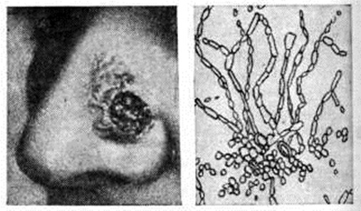 Диагноз. Помимо клинического наблюдения в динамике, необходима лабораторная диагностика. При микроскопическом исследовании патологический ткани возбудитель обнаруживают редко, в виде фрагментов тонкого мицелия и спор, поэтому важно выделение чистой культуры грибка. На среде Сабуро колонии возбудителя растут медленно в виде белых дисков, которые затем становятся выпуклыми, полушаровидными, плотными, коричнево-ржавой окраски, позднее — морщинистыми. Микроструктура культуры содержит характерные для рода Hemispora элементы — так называемый гемиспоры, или протоспоры (не вполне оформленные споры), дейтороспоры (более оформленные споры) и цепочки спор возбудителя (рис. 2). Сыворотка крови больного в концентрации 1 : 400 агглютинирует штамм грибка, выделенного из очага поражения.