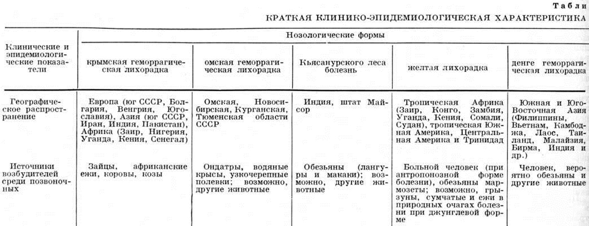 Из клещевых Геморрагические лихорадки человека особое внимание привлекает крымская геморрагическая лихорадка (смотри), широко распространённая в СССР и в ряде стран Европы, Азии и Африки. Из других клещевых Геморрагические лихорадки — омская геморрагическая лихорадка (смотри) и в Индии Кьясанурского леса болезнь (смотри), распространённые в сравнительно узких эндемических зонах; они имеют определённое сходство по клин, картине, но отличаются друг от друга по этиологии и эпидемиологии.