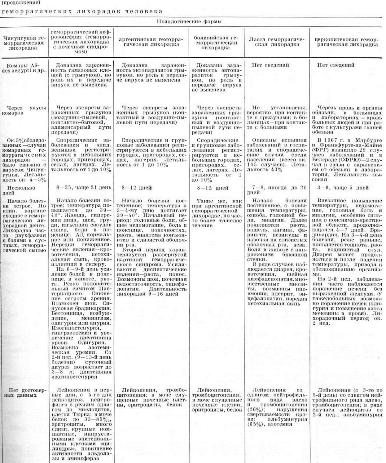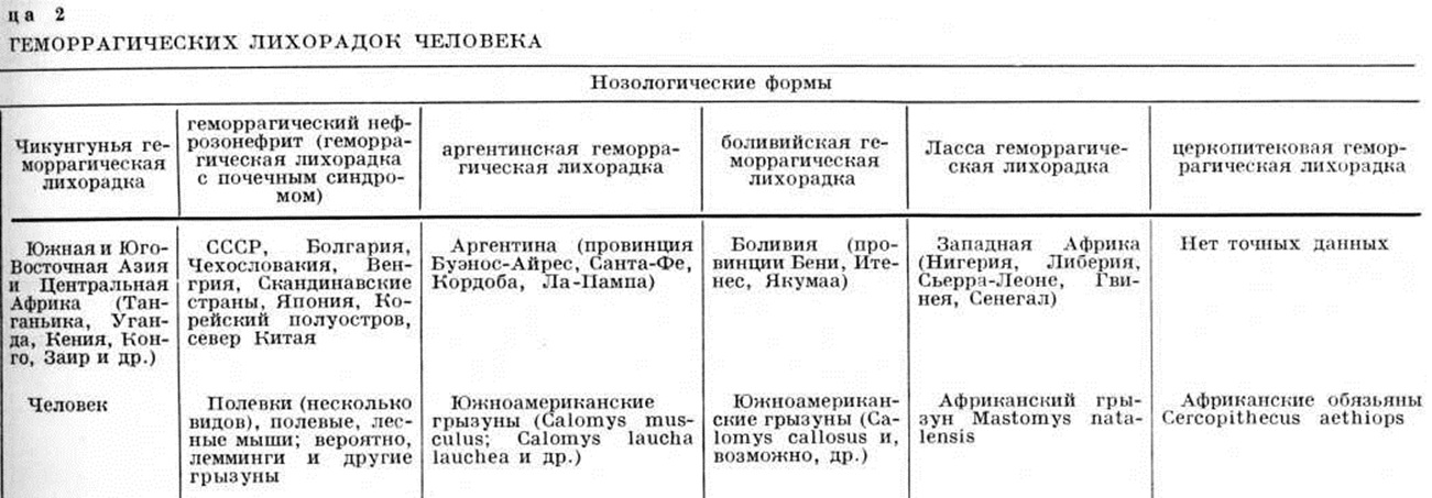 Вышеуказанные Геморрагические лихорадки бесспорно этиологически связаны с арбовирусами, то есть возбудителями, передаваемыми человеку через укусы кровососущих членистоногих паразитов — клещей или комаров (смотри Арбовирусы). Существует, однако, ещё 5 самостоятельных форм Геморрагические лихорадки, которые не передаются человеку через укусы членистоногих, а заражение происходит при контакте людей с животными — источниками инфекции. К ним относятся геморрагический нефрозонефрит (смотри), аргентинская и боливийская геморрагические лихорадки (смотри Южноамериканские геморрагические лихорадки), Ласса геморрагическая лихорадка (смотри Ласса лихорадка) и церкопитековая геморрагическая лихорадка (Марбургвирусная болезнь), связанная с заражением от мартышек (смотри Церкопитековая геморрагическая лихорадка). Эти Геморрагические лихорадки не принадлежат к арбовирусным болезням человека, хотя считается, что при некоторых из них отдельные виды кровососущих членистоногих эктопаразитов имеют эпизоотологическое значение в поддержании очагов инфекции среди животных.
