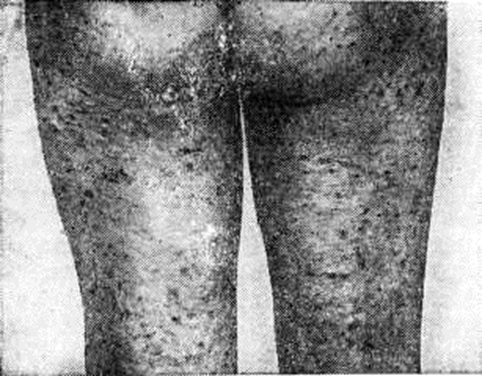 Гемосидероз кожи наблюдается преимущественно у мужчин. Характерны резко отграниченные пятна коричневато-красного цвета, различных оттенков, не исчезающие при надавливании без воспалительных изменений в окружающей коже.