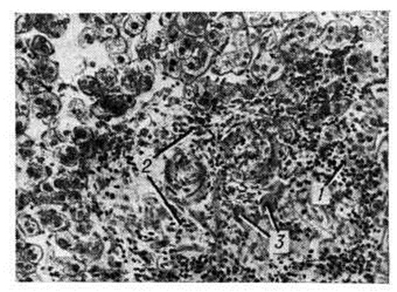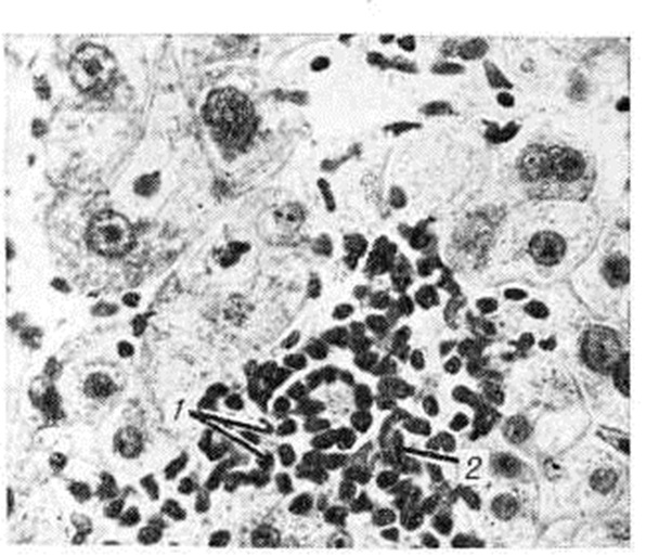 В ответ на первичное поражение гепатоцита любого генеза (вирусом, токсином, медикаментами и так далее) образуется антиген, индуцирующий сенсибилизацию лимфоцита, который вступает в реакцию с поражённым гепатоцитом непосредственно или с помощью антител, синтезируемых плазматическими клетками. Реакция антиген — антитело на тканевом уровне приводит к цитолизу интактных гепатоцитов. Этот процесс контролируется гомеостатическим механизмом, под влиянием которого антиген со временем исчезает и прекращается аутоаллергическая реакция лимфоцитов. В отдельных случаях наблюдается персистирование антигена, что поддерживает процесс массивного цитолиза гепатоцитов в результате цитотоксического эффекта реакции антиген — антитело (смотри Антиген — антитело реакция). Аутоиммунные процессы играют важную роль в патогенезе некротизирующего и особенно люпоидного Гепатит, определяя его самопрогрессирующее (независимое от этиологический фактора) течение. В механизме этого прогрессирования имеет значение нарушение микроциркуляции крови в печени вследствие развития базальной мембраны вдоль синусоидов и образования коллагеновых волокон между синусоидами и печёночными клетками. В патогенезе холестатических Гепатит основным является нарушение метаболизма желчных кислота и образования желчных мицелл в печёночной клетке, а также нарушение экскреции желчи в желчные капилляры и оттока её по холангиолам и другим внутрипечёночным желчным протокам. Патологическая анатомияПатоморфологические картина острых диффузных Гепатит, развивающихся при ряде инфекционных заболеваний (инфекционном мононуклеозе, адено- и энтеровирусной инфекции, иктеро-геморрагическом лептоспирозе, жёлтой лихорадке и другие), во многом сходна с патоморфологический. картиной вирусного гепатита, которому свойствен комплекс полиморфных изменений, охватывающих паренхиму и строму печени, а также внутрипечёночные желчевыводящие пути. Поэтому их дифференциальная диагностика по гистологический картине затруднена или даже невозможна [В. В. Золотаревский, 1969; Бьянки (С. Bianchi), 1967]. Иногда поражение паренхимы ограничивается только дистрофическими (зернистая и балонная дистрофии, парциальный некроз) изменениями гепатоцитов (дистрофический гепатит). В других случаях наблюдаются выраженные явления некробиоза, в результате которого некрозу подвергаются отдельные гепатоциты, паренхима центральной зоны или всей печёночной дольки (некротический гепатит). Патологический процесс может ограничиваться активацией мезенхимально-клеточных элементов и клеточной инфильтрацией портальных полей (межуточный гепатит). Так, при скарлатине, дифтерии, пневмонии наблюдается отёк портальных полей, активация и пролиферация эндотелиальных клеток с образованием клеточных инфильтратов. Дистрофические изменения в паренхиме выражены не резко. При сепсисе клеточная инфильтрация выражена резко, среди клеточных элементов отмечается много сегментоядерных лейкоцитов. Иногда клеточная инфильтрация носит очаговый характер, в ткани печени, вблизи портальных трактов, наблюдается формирование гранулём (брюшной и возвратный тиф); при сыпном тифе возможны типичные для этой инфекции васкулиты, что иногда приводит к очаговым некрозам паренхимы. При персистирующем Гепатит преобладаю