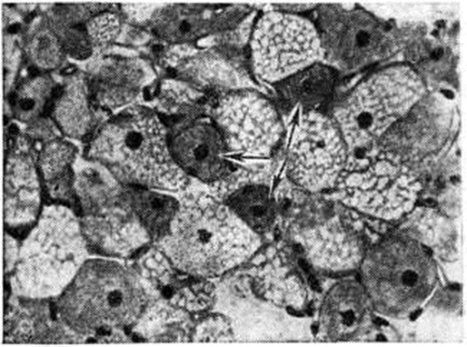 На разрезе опухоль буроватого цвета с чёткими очертаниями, дольчатого строения. Микроскопически состоит из крупных округлых или полигональных клеток с чёткими границами и центрально расположенными ядрами (рисунок 1). Клетки группируются в ячейки или дольки окружённые нежной стромой. Различают два вида клеток: одни с гомогенной, окрашивающейся в тёмно-розовый цвет цитоплазмой, содержащей небольшое количество жира, другие — мелкозернистые или пенистые, перегруженные липидами (нейтральным жиром, холестерином.