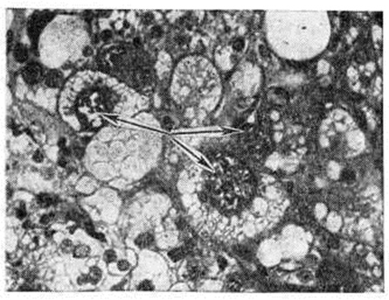 Злокачественная Гибернома выделена из группы липосарком (смотри), отличается от них более длительным течением, реже метастазирует. Локализация её, возраст и пол больных те же, что и при доброкачественных Гибернома Опухоль дольчатого вида буроватого цвета, нередко с изъязвлением и очагами некроза. Микроскопически отмечается выраженный полиморфизм клеток (рисунок 2), характерны гигантские многоядерные клетки, содержащие в цитоплазме мелкокапельный жир (уродливые «тутовые» клетки). Нередко встречаются участки, напоминающие липосаркому, полиморфноклеточную саркому, рабдомиобластому. Злокачественные Гибернома следует дифференцировать с липосаркомой, метастазом гипернефроидного рака, рабдомиосаркомой.