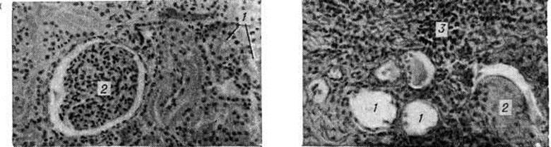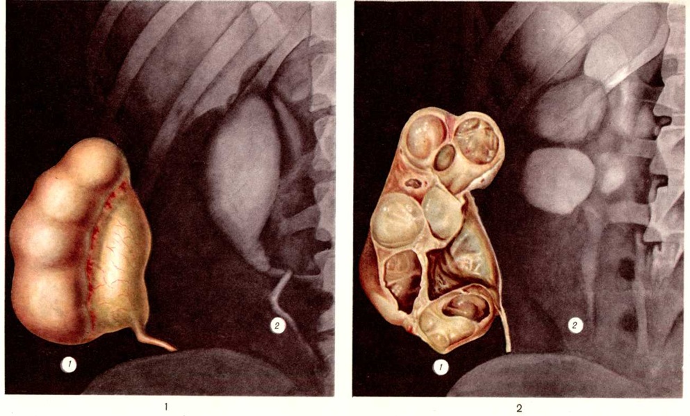 Травматический Гидронефроз развивается вследствие сдавления мочеточника гематомой в результате его повреждения (огнестрельное ранение, разрыв при операциях) с последующим образованием спаек или стриктуры. При всех видах механического затруднения оттока мочи в возникновении Гидронефроз имеют значение и функциональные нарушения лоханочно-мочеточникого сегмента. ПатогенезПри Гидронефроз процесс секреции и реабсорбции мочи сохраняется, но имеет место некоторое отставание эвакуации мочи из лоханки, что обусловливает накопление содержимого и повышение давления в ней. Это даёт право гидронефротическую почку почти всегда считать функционирующим органом, что доказано радиоизотопными исследованиями — из закупоренной почечной лоханки в ток крови реабсорбируются изотопы натрия, йода, коллоидного золота [Перски (L. Persky) с соавторами, 1955]. В начальных стадиях гидронефротической трансформации при стазе мочи в лоханке наступает гипертрофия мускулатуры лоханки и чашечек. Постепенно нарастающая гипертрофия спиральной мускулатуры чашечек приводит к резко повышенному давлению мочи на сосочек и форникальную зону. Это создаёт трудности нормальному выделению мочи из сосочков в почечную лоханку, в некоторой степени компенсируемые уменьшенной секрецией мочи. Однако это относительное равновесие функции почки продолжается недолго. Рабочая гипертрофия мышечных элементов чашечек и лоханки сменяется их истончением и разволокнением, что нарушает отток мочи и приводит к дилатации почечной лоханки и чашечек с последующей атрофией сосочков и почечной паренхимы. Одним из важных моментов в возникновении Гидронефроз является задержка выведения мочи из функционально деятельных участков почки, что наблюдается даже при кратковременных повышениях внутрилоханочного давления. Высокое давление в почечной лоханке вызывается не только поступающей в неё мочой, но и чрезмерным сокращением мускулатуры чашечек, особенно форникального и чашечного сфинктеров. А. Я. Пытель (1959) придаёт большое значение мышечной системе чашечек и лоханки в оттоке мочи по собирательным канальцам и межтканевой жидкости. Уже спустя 24 часа после закрытия просвета мочеточника начинается атрофия почечных пирамид вследствие сдавления их трансфорникальным отёком, сосочки постепенно уплощаются. Через 6—10 дней атрофия пирамид достигает большей степени, сосочки становятся вогнутыми. Наряду с деформацией форниксов происходит расширение просвета собирательных канальцев, облегчающее поступление мочи из лоханки в тубулярную систему. При полной окклюзии мочеточника происходят множественные форникальные разрывы, в результате чего создаётся рефлюкс мочи в почечное интерстициальное пространство, в кровеносную или лимфатические, систему. Повышенное внутри-паренхиматозное давление нарушает кровоток в сосудах мозгового вещества почки, что приводит к атрофии пирамид. Сдвиги кровообращения в кортикальных и медуллярных капиллярах сопровождаются изменениями кровообращения в паренхиме и тканевом обмене, а также кислородным голоданием, способствующими тотальной атрофии коркового вещества почки. Кьяудано (М. Chiaudano, 1958), Н. А. Лопаткин (1960) полагают, что гидронефротическая трансформация протекает по двум фазам: в первой атрофируется мозговое вещество, во второй — корко