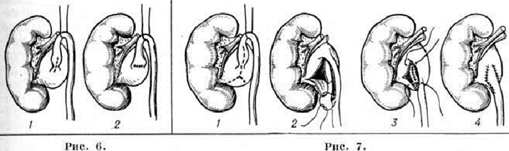 Показанием к пластическим операциям являются те стадии одно- и двустороннего Гидронефроз, при которых функция паренхимы в достаточной степени сохранена, а причина, вызвавшая болезнь, может быть устранена. Из множества способов оперативного лечения при Гидронефроз, возникших на почве изменений в области лоханочно-мочеточникового сегмента, чаще всего применяют операцию Фенгера, которая заключается в продольном рассечении стриктуры мочеточника или лоханочно-мочеточникового сегмента и сшивании в поперечном направлении (рисунок 6). Распространена и операция по Фолею — создание воронкообразного расширения прилоханочного отдела мочеточника (рисунок 7). Обязательным условием пластических операций является дренирование лоханки, сохраняемое в послеоперационном периоде от 12 до 30 дней; удаление дренажа допустимо лишь после восстановления свободного оттока мочи по мочеточнику. Условия «конечного» кровоснабжения почки ограничивают рассечение «добавочного сосуда». Высвобождение из спаек сосуда и лоханочно-мочеточникового сегмента, перемещение мочеточника антевазально с последующим пиелоанастомозом изменяют соотношения между сосудом и сегментом, в результате чего сосуд оказывается позади его. Наиболее широкое распространение по этим показаниям получили операции Альбаррана и Калпа — де Верда. Операция Альбаррана состоит в продольном рассечении мочеточника, начиная с неизменной части, с переходом через стриктуру на лоханку и наложении пиелоуретрального анастомоза (рисунок 8). Операция Калпа — де Верда заключается в выкраивании большого лоскута на ножке из лоханки, перемещении его на мочеточник, благодаря чему формируется новый сегмент мочеточника с большим просветом (рисунок 9). При внутрипочечной лоханке, создающей неблагоприятные условия для выполнения одной из перечисленных операций, целесообразно применить операцию уретерокаликоанастомоза (рисунок 10). Пластические операции иногда дополняют дупликацией почки, иногда с использованием различных тканей и синтетических материалов. К нефрэктомии (смотри) следует прибегать при таком одностороннем Гидронефроз, когда атрофия паренхимы выражена в резкой степени и функция почки глубоко изменена. Оставлять такую почку опасно из-за осложнений. Абсолютно противопоказана нефрэктомия в тех случаях, когда и вторая почка поражена каким-либо патологический процессом. Пиелостомия (смотри) и нефростомия (смотри) при Гидронефроз имеют ограниченные показания и применяются как самостоятельные операции в тех случаях, когда невозможно восстановить отток мочи в мочевой пузырь. Прогноз зависит от стадии процесса, его этиологии, состояния другой почки. В начальных стадиях одностороннего Гидронефроз, особенно если его причиной является «добавочный сосуд», оперативное вмешательство способствует выздоровлению и восстановлению нормальной функции почки. Отягощают прогноз пиелонефрит, двусторонние поражения, а также другие заболевания второй почки; но и в этих случаях комплексное лечение (противовоспалительная терапия и операция) позволяет длительно сохранять трудоспособность пациента. Гидронефроз у детей может быть не только врождённым заболеванием, но и приобретённым. Этиология — нарушение пассажа мочи из-за механического препятствия в области лоханочно-мочеточников